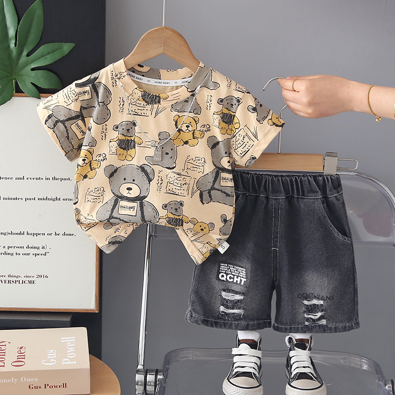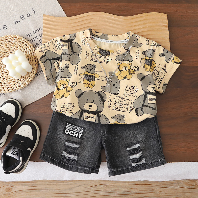 Set modern de 3 piese din tricou, pantaloni scurți din denim și lănțișor Modern Bear