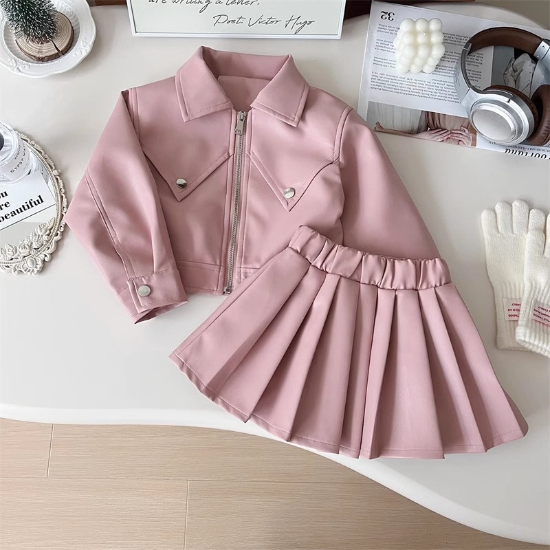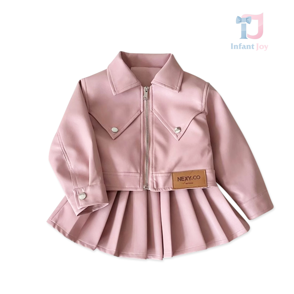 Set modern din 2 piese, cu jachetă din piele ecologică și fustă plisată Cool School Girl Pink