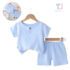 – Bluză albastră cu mânecă scurtă, model clasic cu un nasture frontal.