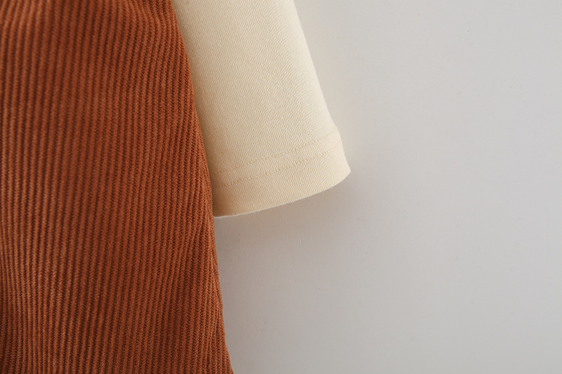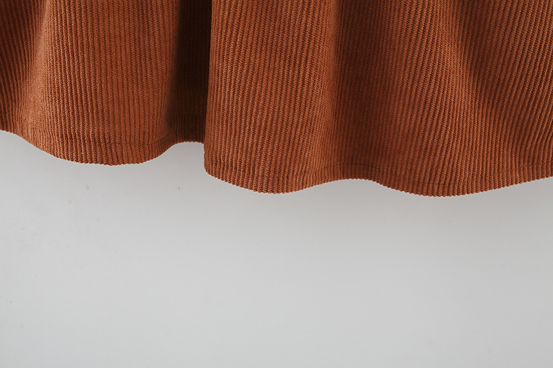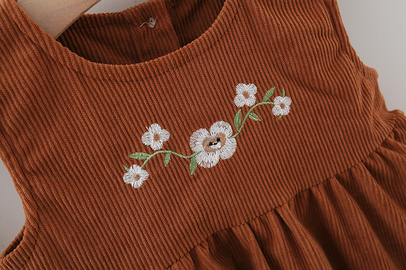 – Rochie din material moale și în relief, de culoare caramel și broderie ca element de accent + închidere la spate cu nasturi.