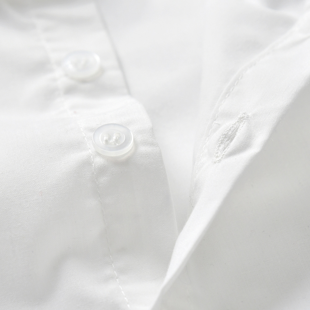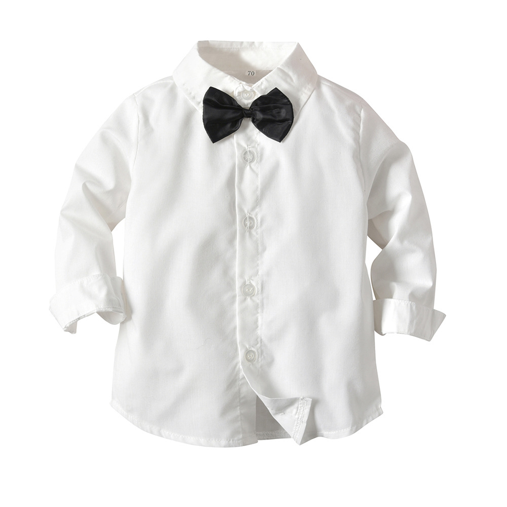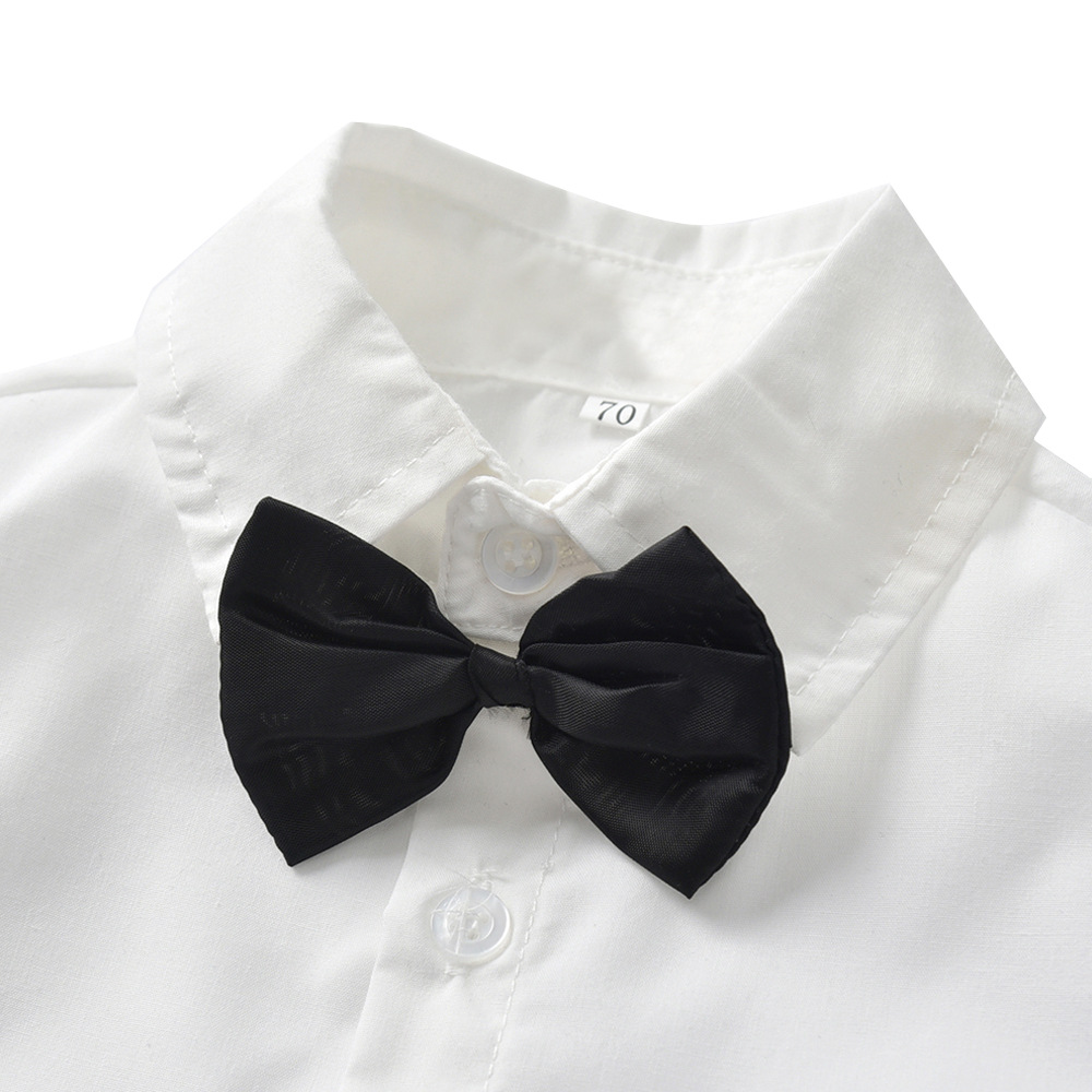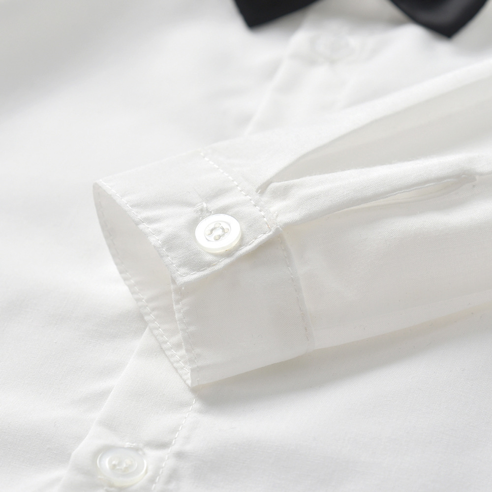 – Cămașă cu mânecă lungă, confecționată din material fin și respirabil. Model cu guler clasic, închidere frontală cu nasturi și un accent special – papion satinat, asortat.