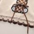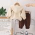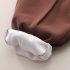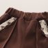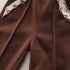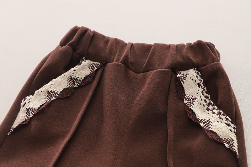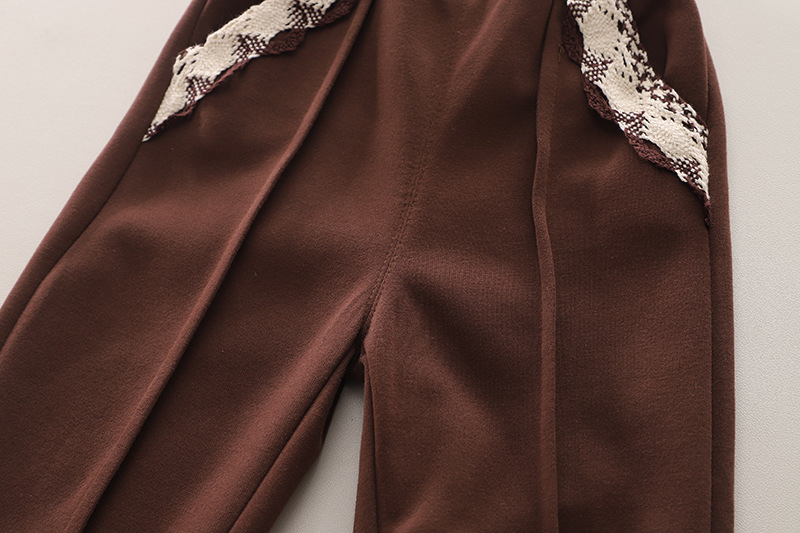 – Pantaloni din bumbac moale, de culoare maro închis, cu cusături accentuate pe craci. Talie elastică pentru confort în mișcare și buzunare decorate cu dantelă tricotată.