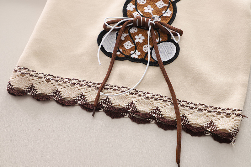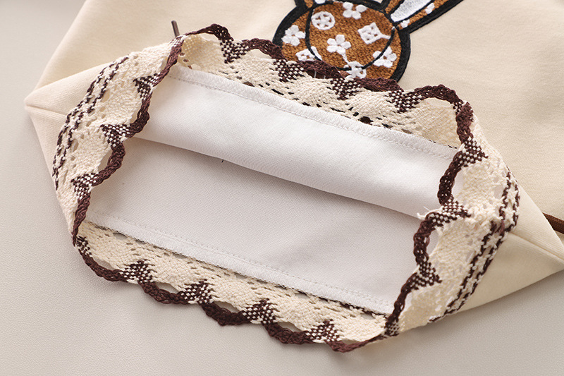 – Bluză/Hanorac cu glugă din material de bumbac de înaltă calitate, de culoare crem. Adăugate broderii frumoase din dantelă tricotată pe umeri + o aplicație mare cu șireturi 3D care evidențiază modelul.