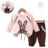 – Bluză/Hanorac cu glugă din material de bumbac de înaltă calitate, de culoare roz. Adăugate broderii frumoase din dantelă tricotată pe umeri + o aplicație mare cu șireturi 3D care evidențiază modelul.