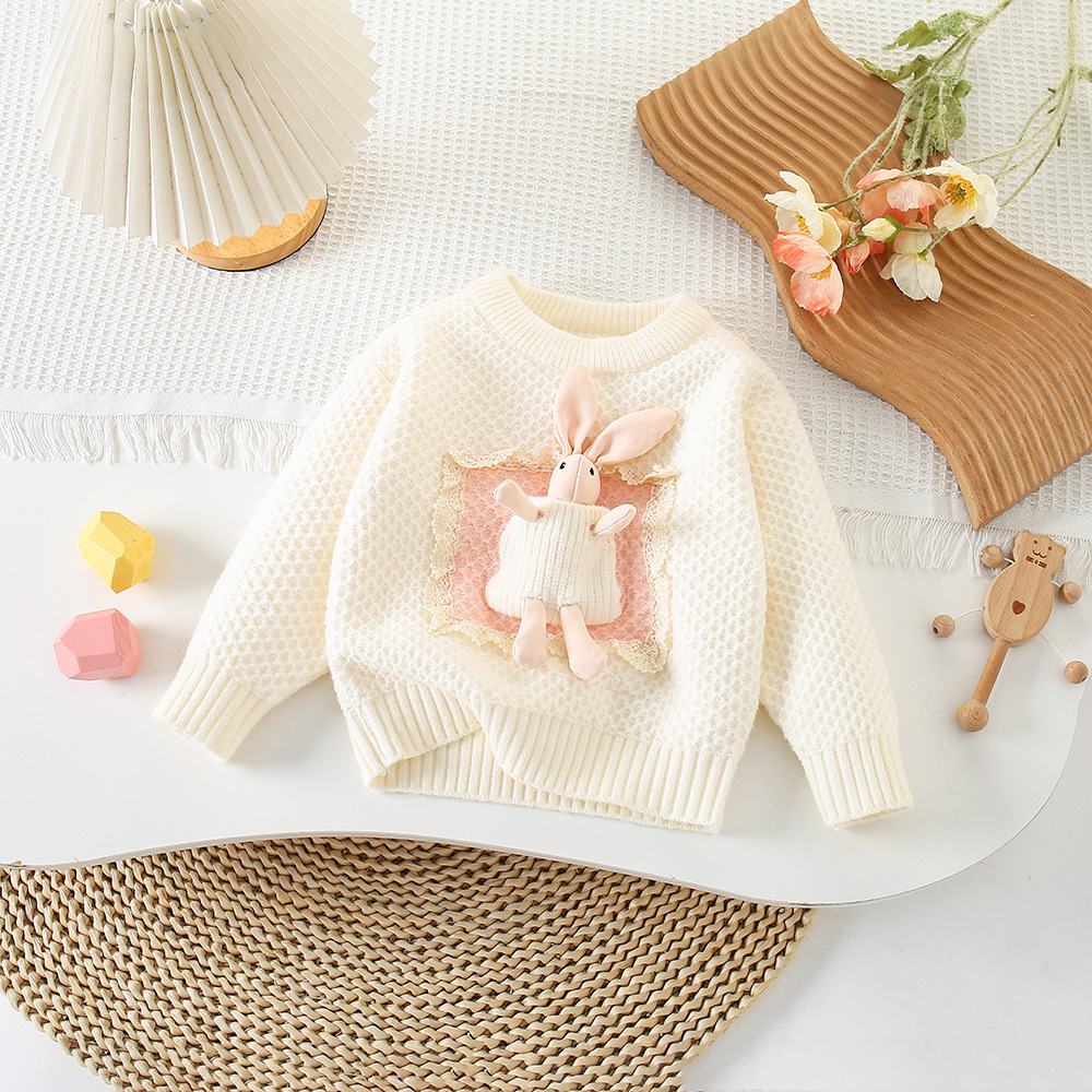-Pulover confecționat din tricotaj moale și de înaltă calitate. Model de culoare vanilie, cu o textură groasă, tip “waffle”. Talia și manșetele elastice, ripsate, oferă confort. Accesoriul principal al modelului – jucărie iepuraș într-un buzunar decorat cu dantelă franțuzească, care adaugă unicitate ținutei.