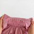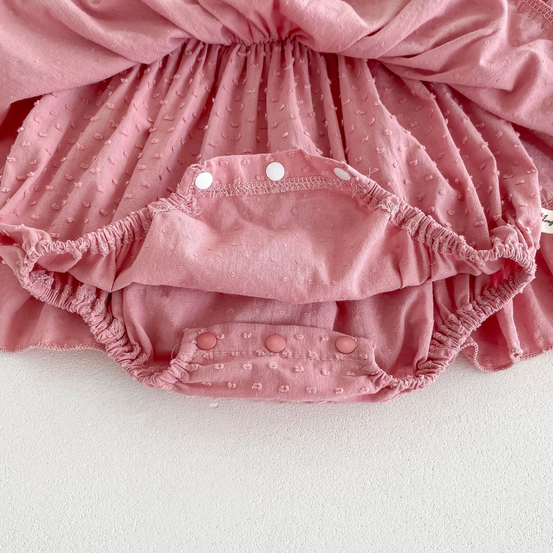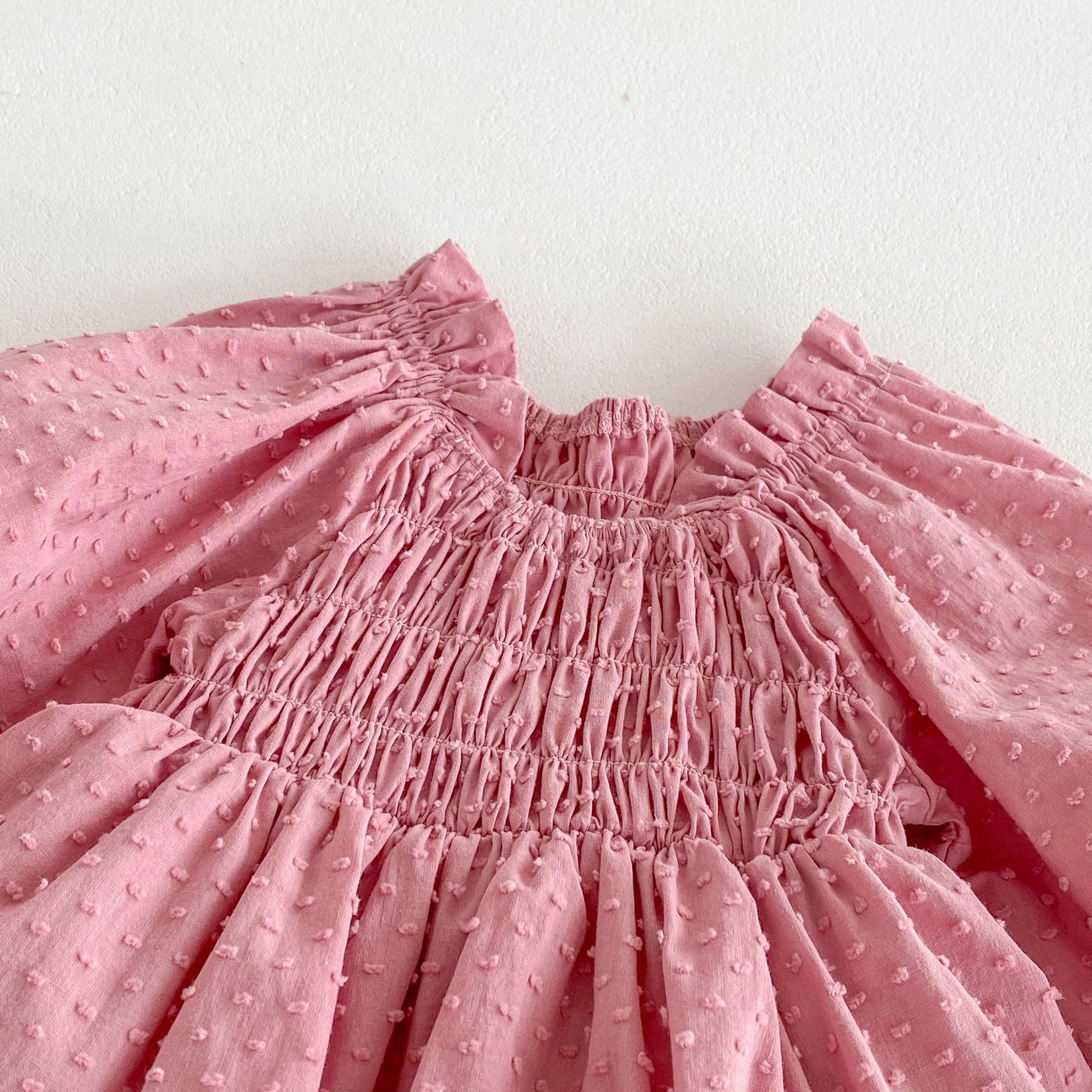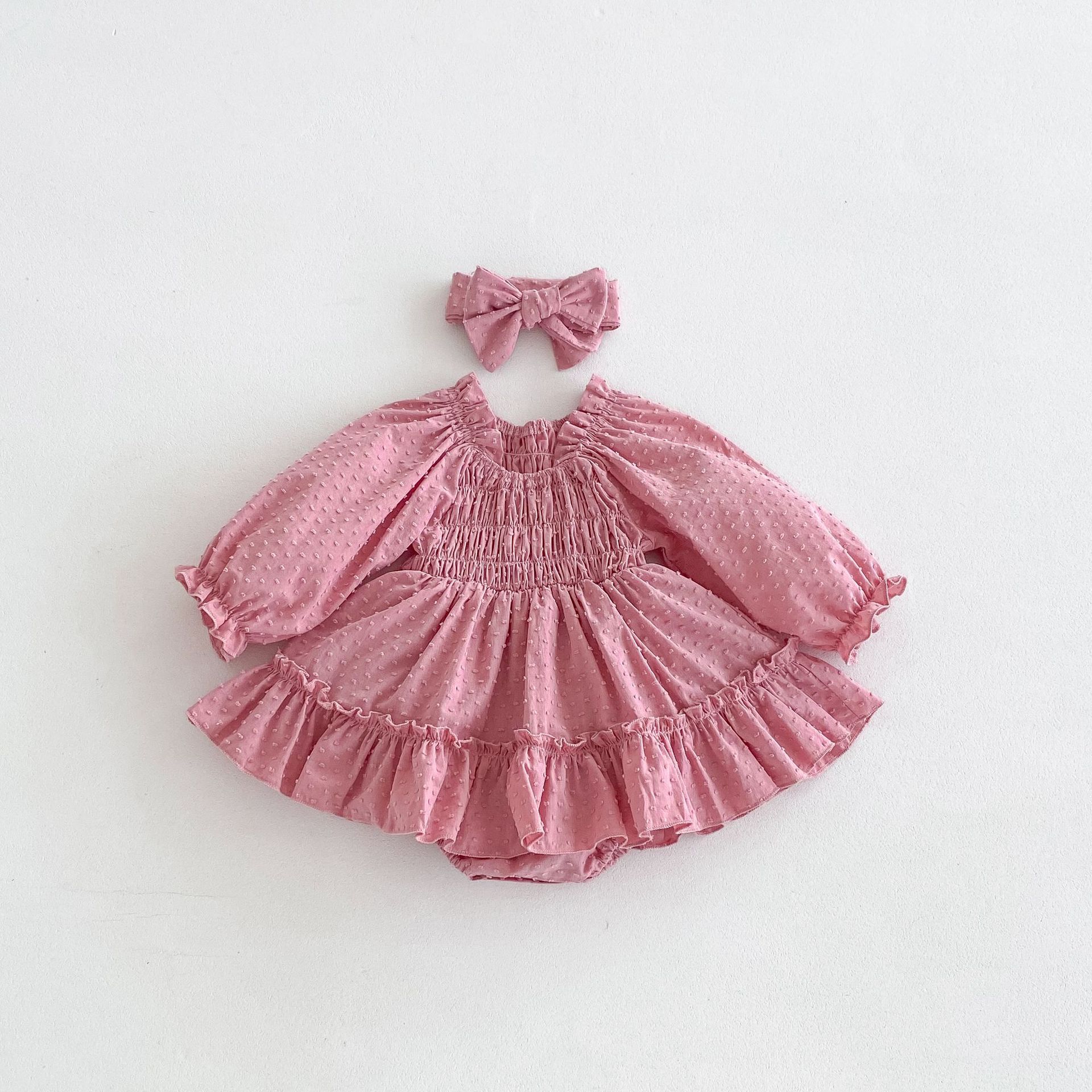 -Rochie/body cu mânecă lungă, confecționată din material ușor și aerisit de calitate superioară, cu model în relief cu buline. Partea superioară are smocking elastic în jurul decolteului și taliei, oferind o potrivire perfectă și o formă elegantă. Mâneci ușor bufante, terminate cu volănașe fine la manșete. Partea inferioară este cu volane în două trepte, care creează volum și un efect delicat de balerină. Închidere practică cu capse ascunse dedesubt – ideală pentru schimbarea scutecelor.