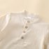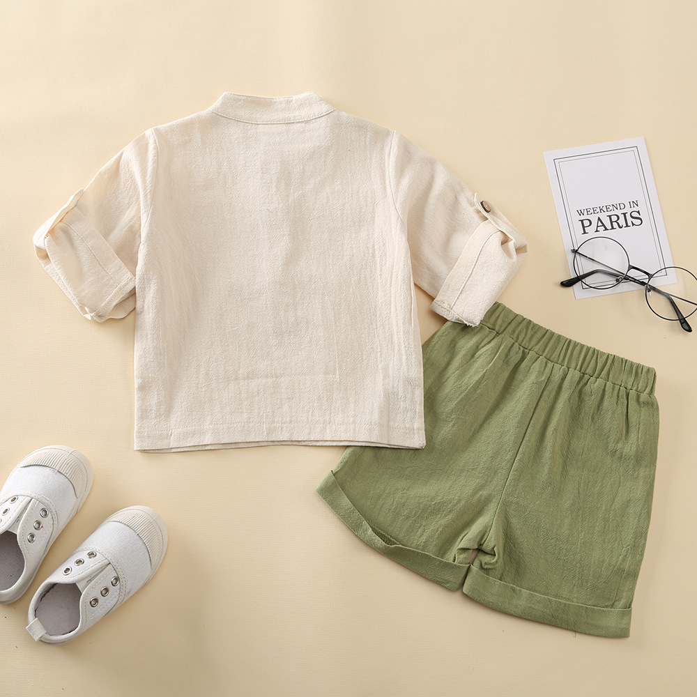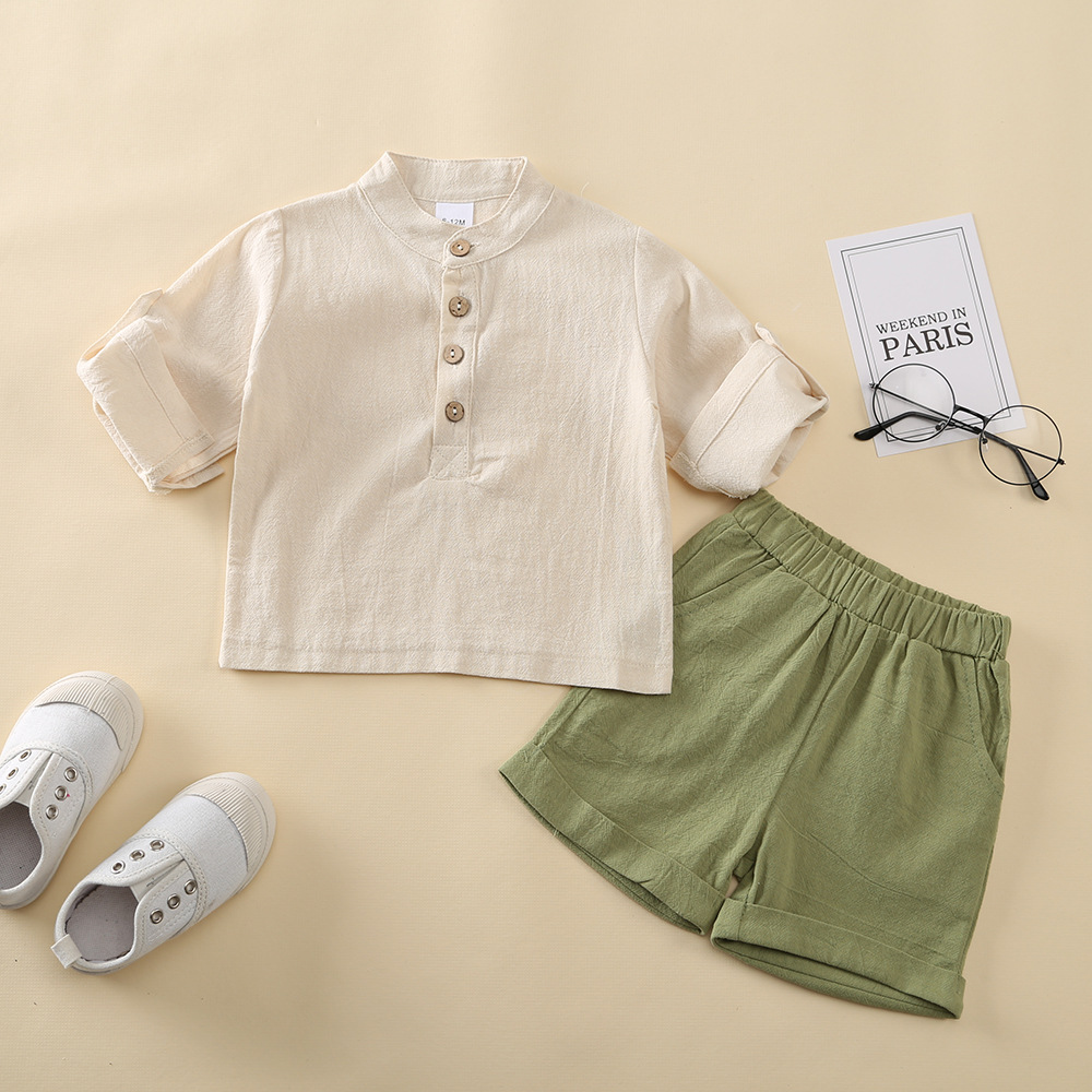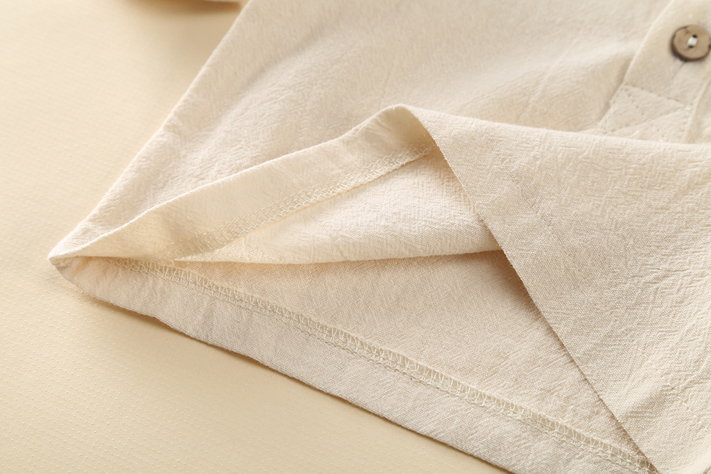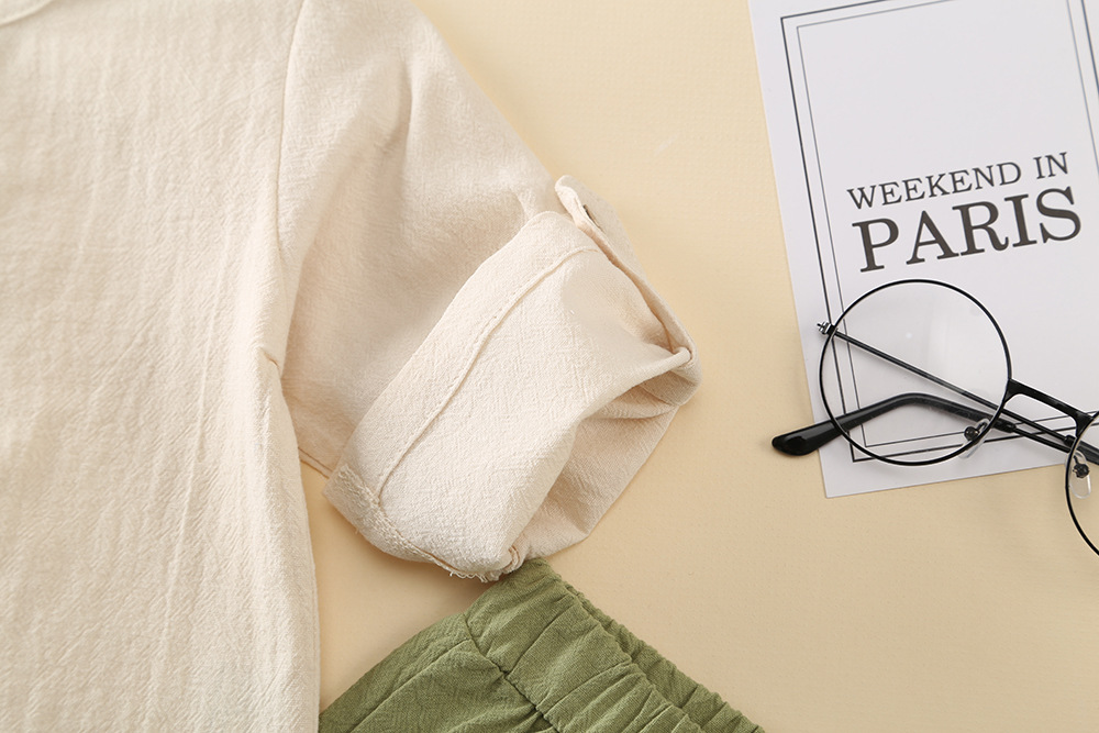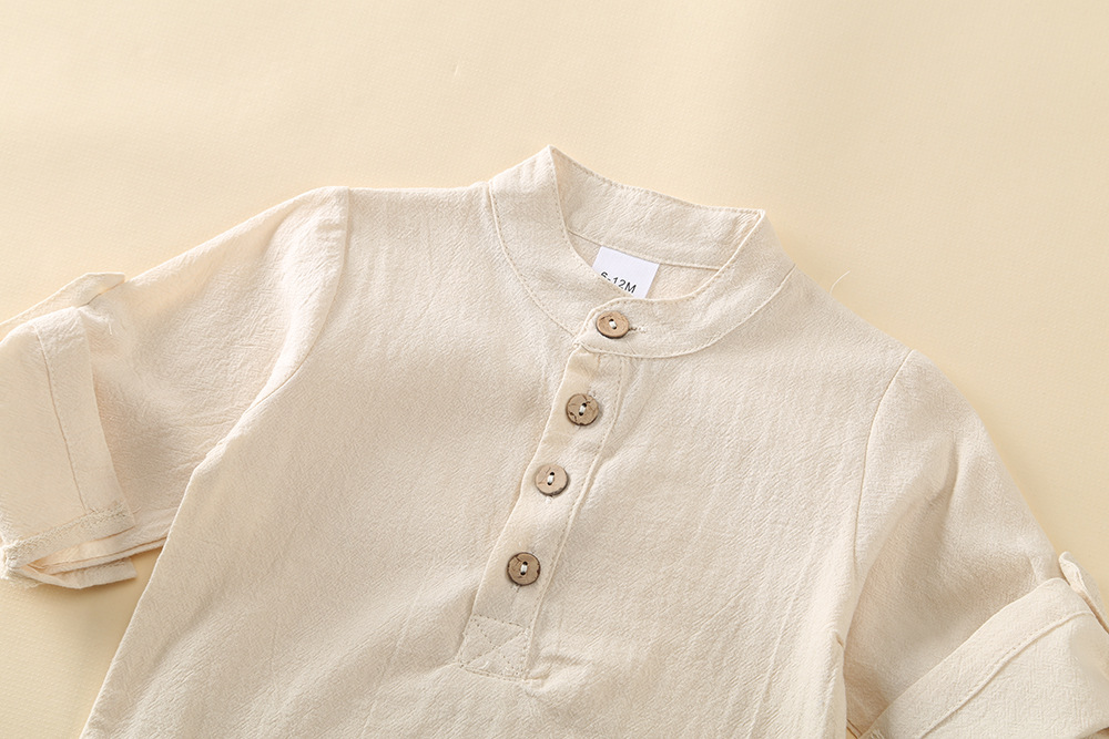 -O cămașă din in ușor și respirabil, de culoare crem. Model cu guler înalt și nasturi din lemn pe întreaga parte frontală + mâneci lungi, cu posibilitatea de a le răsuci și fixa cu un nasture.