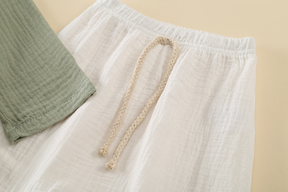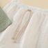 -Pantaloni albi cu talie elastică și șnur decorativ în partea superioară. Model lejer cu tiv elastic în jurul gleznei.