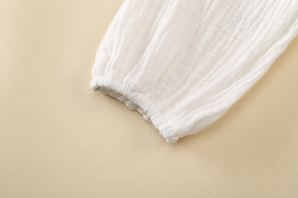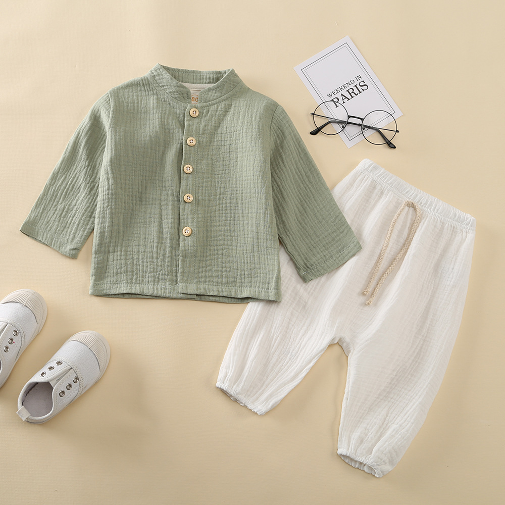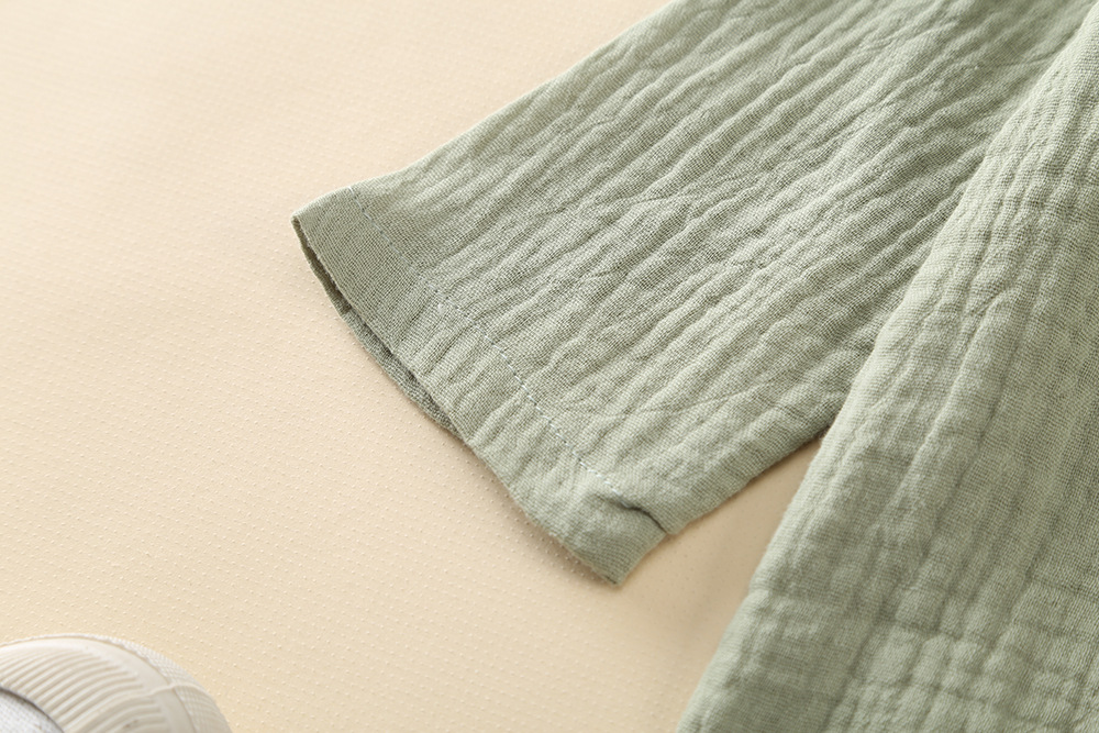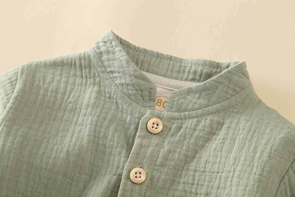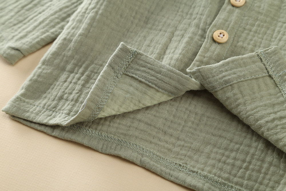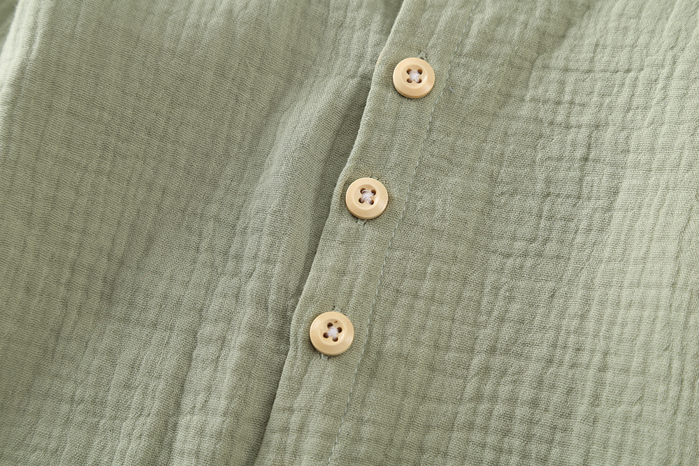 -Cămașă din muselină 100% bumbac, în culoare verde măsliniu. Design cu guler înalt, mâneci lungi și nasturi în față. Croială lejeră ce oferă confort și ventilație naturală.