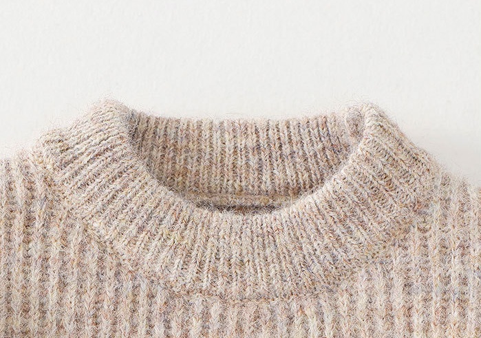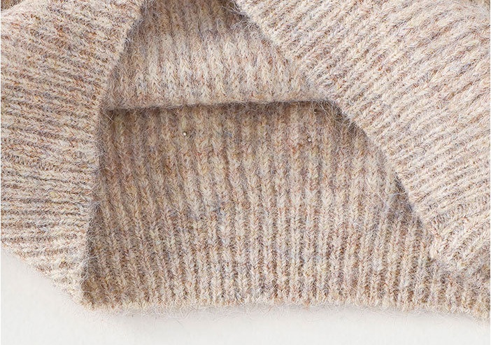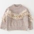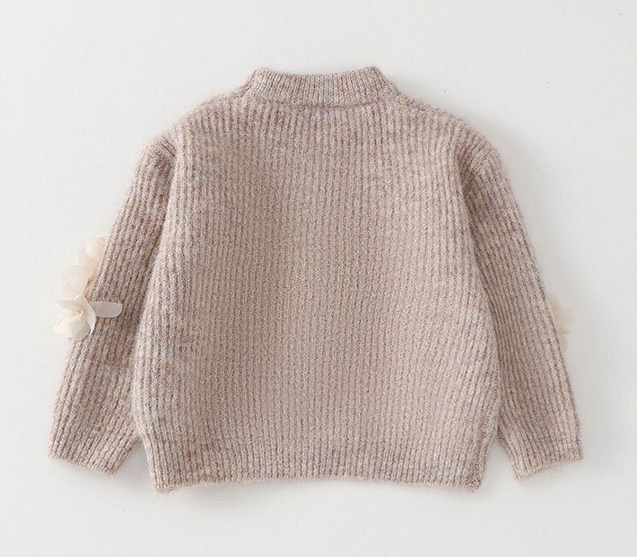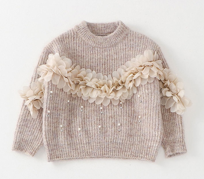 – Pulover cu mânecă lungă, confecționat dintr-un tricot moale și plăcut la atingere, într-o nuanță caldă bej-pudrat. Modelul are un guler rotund clasic și o textură fină tip rips. Accentele sunt elementele florale 3D impresionante din șifon diafan, dispuse pe diagonală în partea din față și pe mâneci, care adaugă volum și o notă de delicatețe aparte. Un plus de rafinament îl oferă aplicațiile discrete cu perle și cristale, care reflectă lumina și conferă o strălucire elegantă.