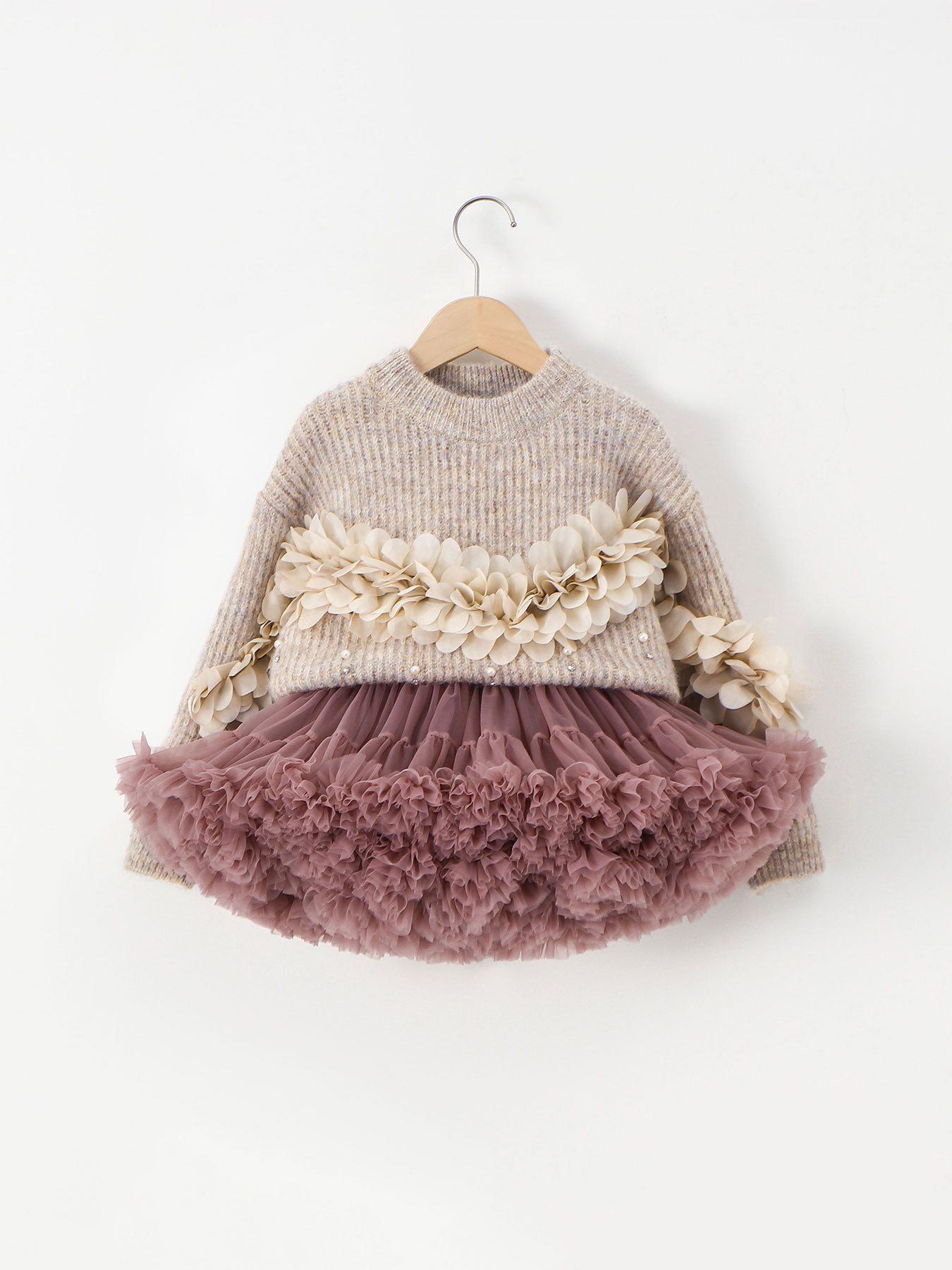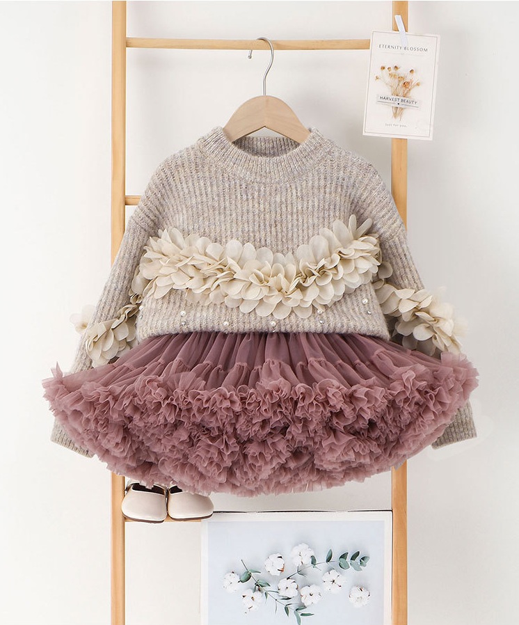 Set premium de 2 piese din pulover cu elemente 3D și perle și fustă cu tutu voluminos Pearl Rose
