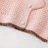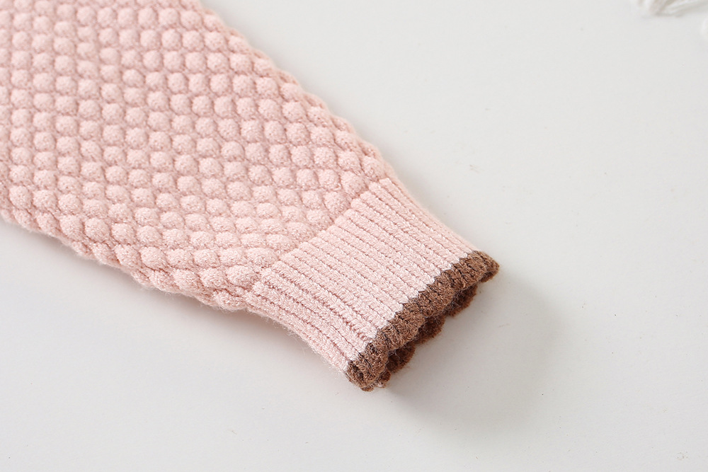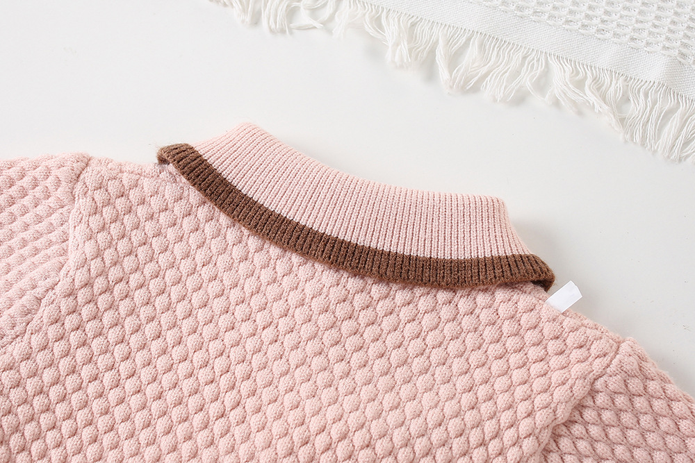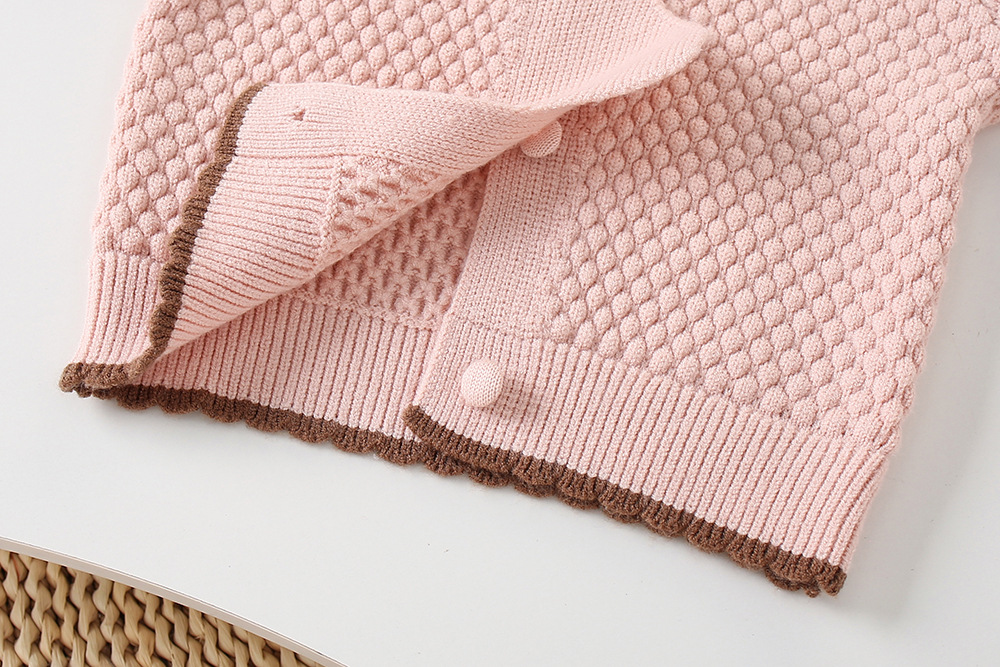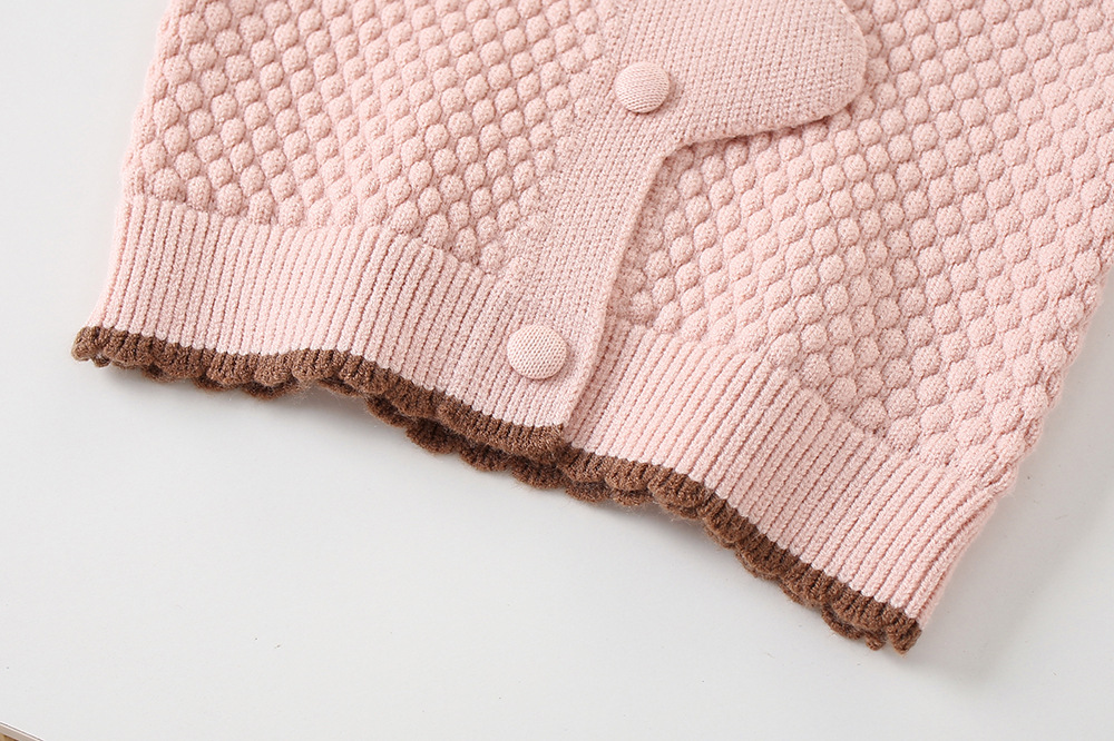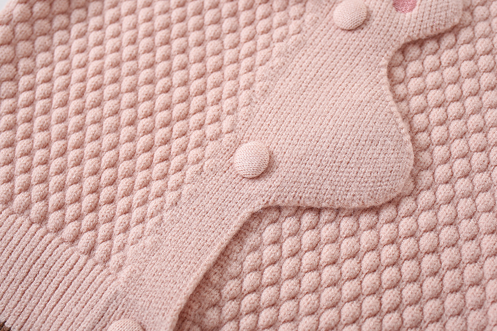 -Cardigan din tricotaj moale și plăcut la atingere, cu model romboidal, de culoare roz. Modelul are o croială standard și guler modern tip „Peter Pan”, decorat cu o aplicație adorabilă cu iepuraș și urechiușe pufoase. Nasturii în ton adaugă un plus de individualitate și dulceață.