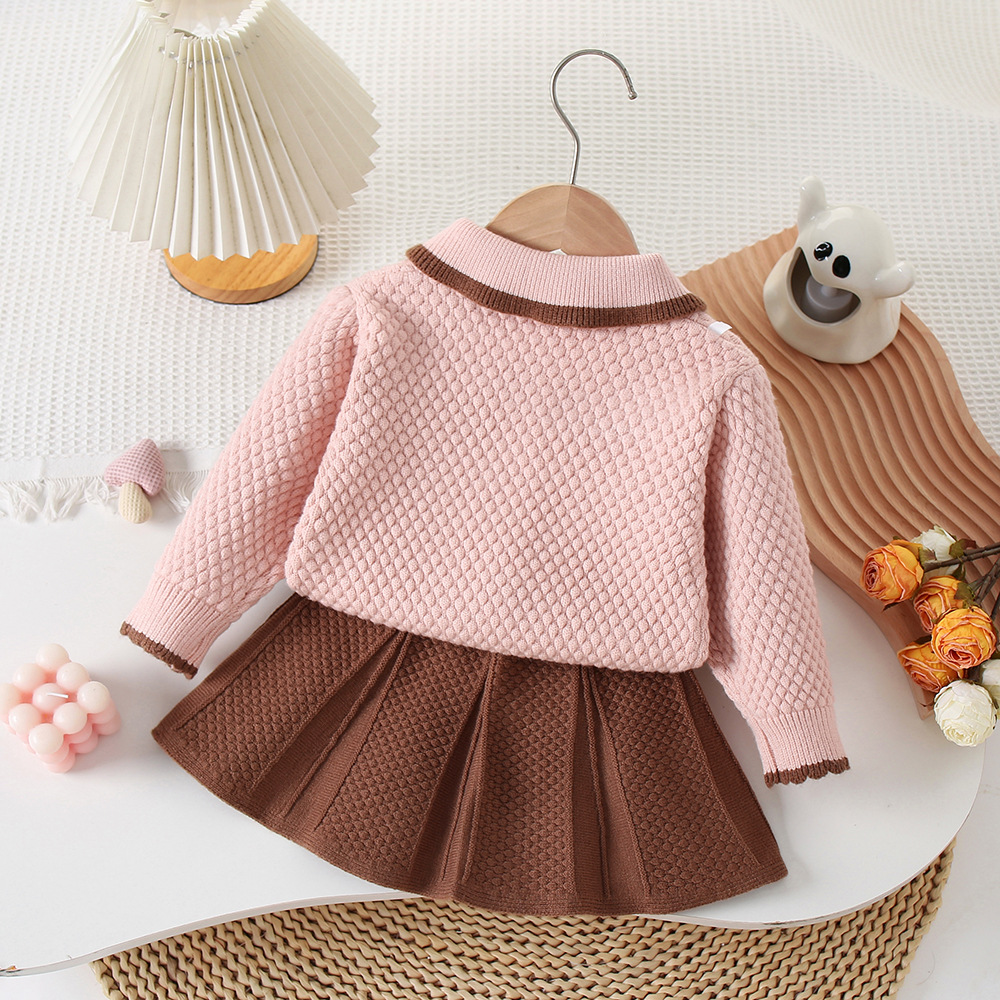 -Fustă de culoare ciocolatie, cu un design plisat clasic, care oferă eleganță ținutei. Combinația dintre rozul delicat și maro cald face ca acest set să fie perfect pentru sezonul toamnă-iarnă.