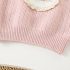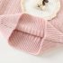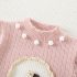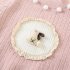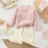 -Pulover din tricot de înaltă calitate, moale, de culoare roz, cu un design cu nervuri. Modelul are un guler rulat scurt și talie și manșete strânse, decorat cu o aplicație 3D de iepuraș, înrămată cu dantelă fină franțuzească și biluțe pufoase în jurul gulerului.