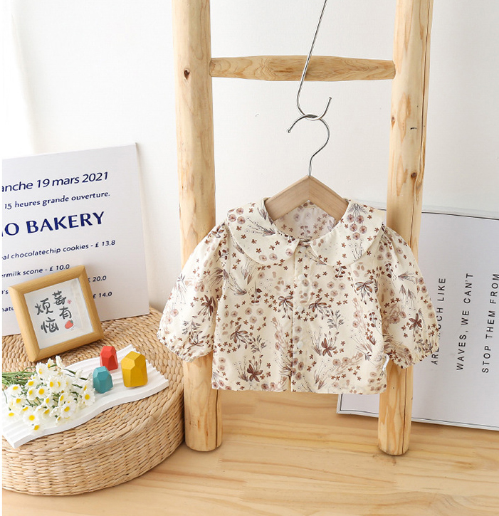– Cămașă moale din bumbac cu imprimeu floral. Model cu guler tip “Peter Pan”, elastic la încheieturi pentru confort și închidere cu nasturi în partea din față.