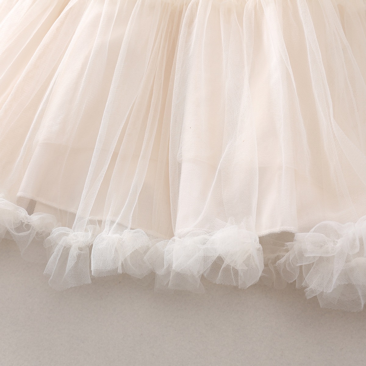 – Rochie din tul cu design amplu și diafan, într-o nuanță delicată de crem. Partea superioară este simplă și elegantă, iar în centru se află accentul – o fundă mare din satin cu nasture perlat, care oferă un aspect rafinat și luxos. Partea inferioară este realizată din mai multe straturi de tul, creând un volum frumos și o mișcare ușoară la fiecare pas. Tivul este finisat cu volănașe fine, pentru un efect și mai bogat.