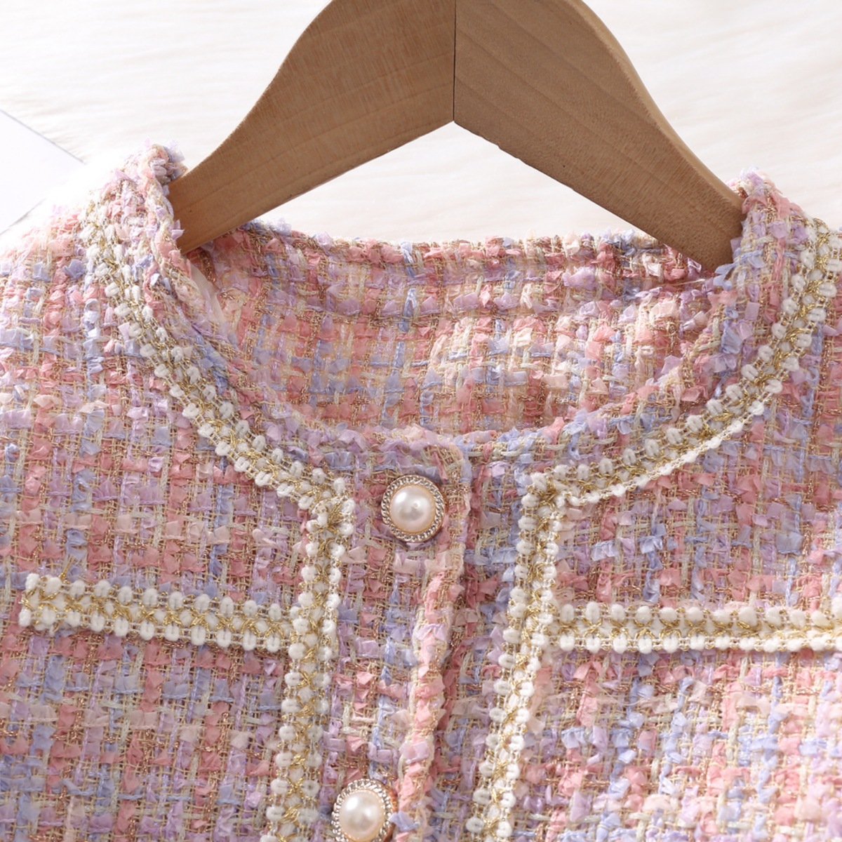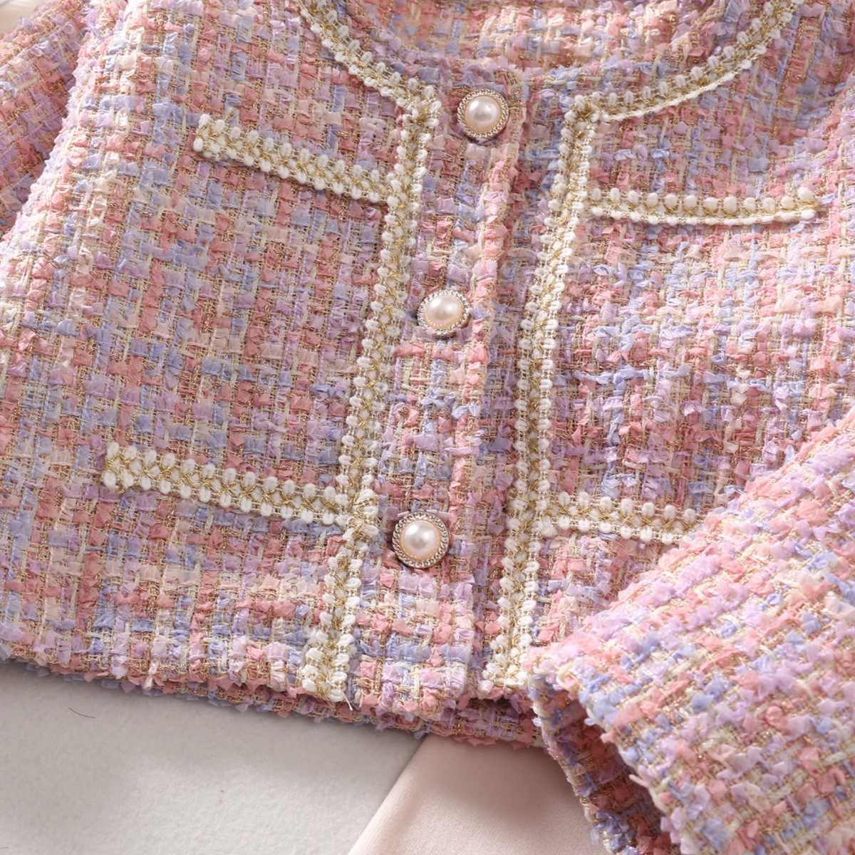 – Sacou scurt tip bolero, confecționat din material texturat tip „tweed“, într-o combinație delicată de nuanțe pastelate – roz, mov și crem. Modelul are croială dreaptă, mâneci lungi și margini decorative care subliniază linia elegantă și completează ținuta cu un detaliu rafinat.