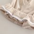 – Pantaloni comozi din catifea côtelé, în nuanță crem, cu talie elastică și volănașe decorative în partea de jos pentru un stil sofisticat și jucăuș.