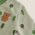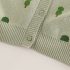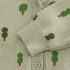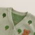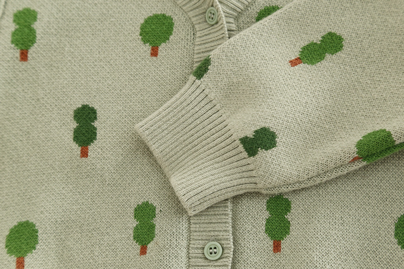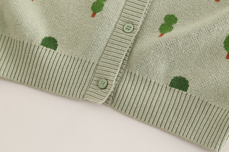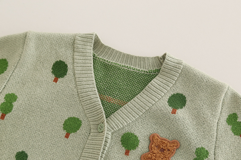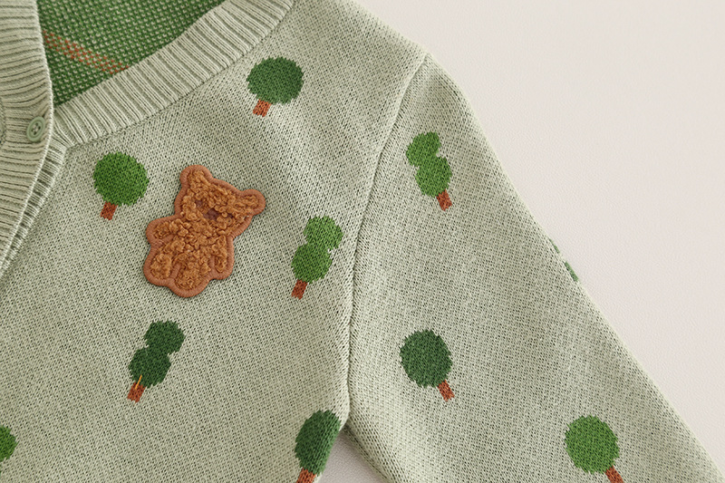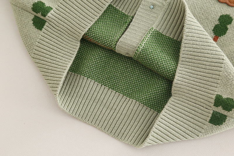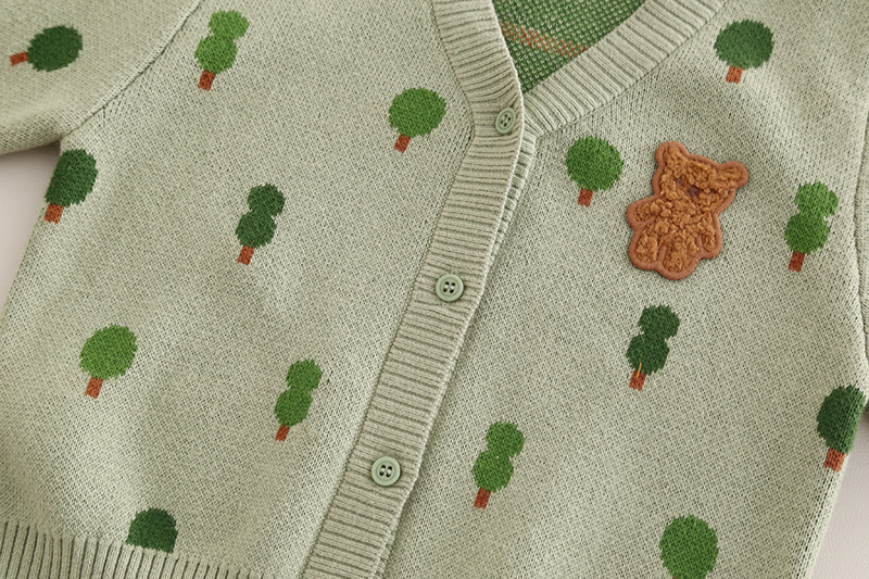 Vestă din tricot fin, în nuanță mentă-verde, decorată cu copăcei și aplicație de ursuleț pe o parte. Model cu linie clasică în V, se închide cu nasturi și este ideal ca strat superior elegant pentru sezoanele de tranziție