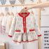 – Cardigan tricotat – fin, moale și călduros, în culoare crem, cu model auriu repetitiv. Decorat cu margini roșii și aurii în jurul gulerului, mânecilor și pe linia din față. Se închide cu nasturi frumoși, strălucitori, tip „perlă”. Are buzunare frontale decorative cu accent roșu-auriu, pentru un plus de farmec.