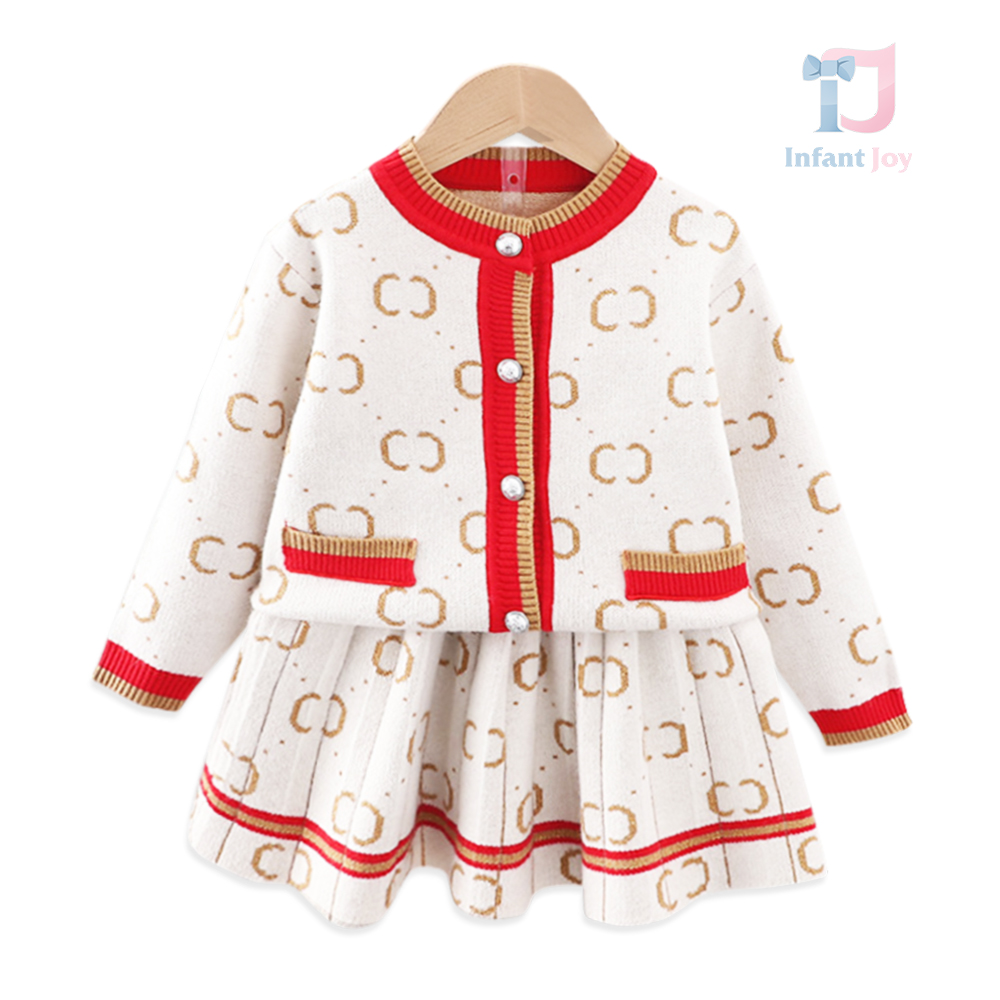 – Fustă plisată – realizată din același tricotaj de înaltă calitate și cu același model, pentru o armonizare perfectă. Talia este confortabilă și elastică, iar partea de jos este finisată cu o bandă lată roșie și un detaliu subțire auriu, care adaugă un contrast elegant.