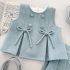 – Vestă dintr-un material de înaltă calitate, într-o nuanță delicată de albastru-deschis. Decorată cu nasturi îmbrăcați, de efect, și două fundițe simetrice care adaugă un plus de farmec și stil. Modelul se închide cu fermoar la spate pentru confort și îmbrăcare ușoară.