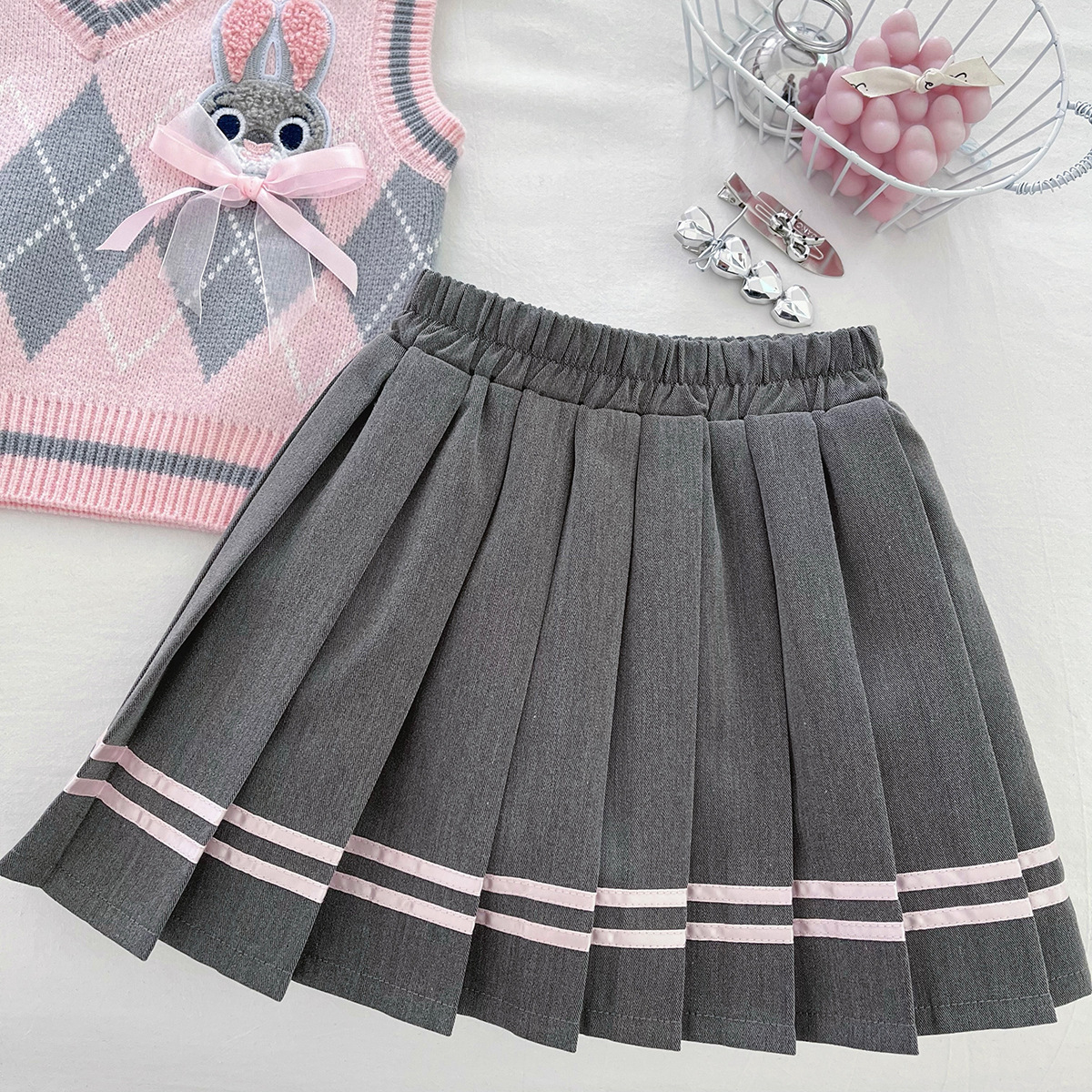 – Fustă plisată, confecționată din material de înaltă calitate în culoare gri, cu talie elastică pentru o potrivire confortabilă. Benzile decorative roz din partea de jos oferă un aspect finisat și stilat.