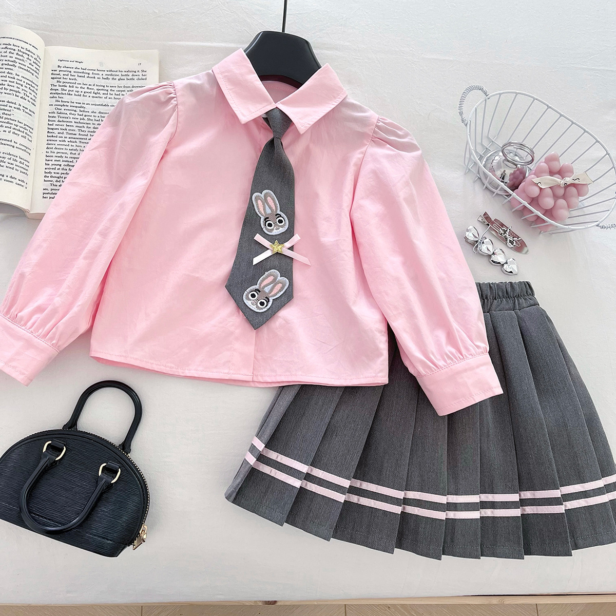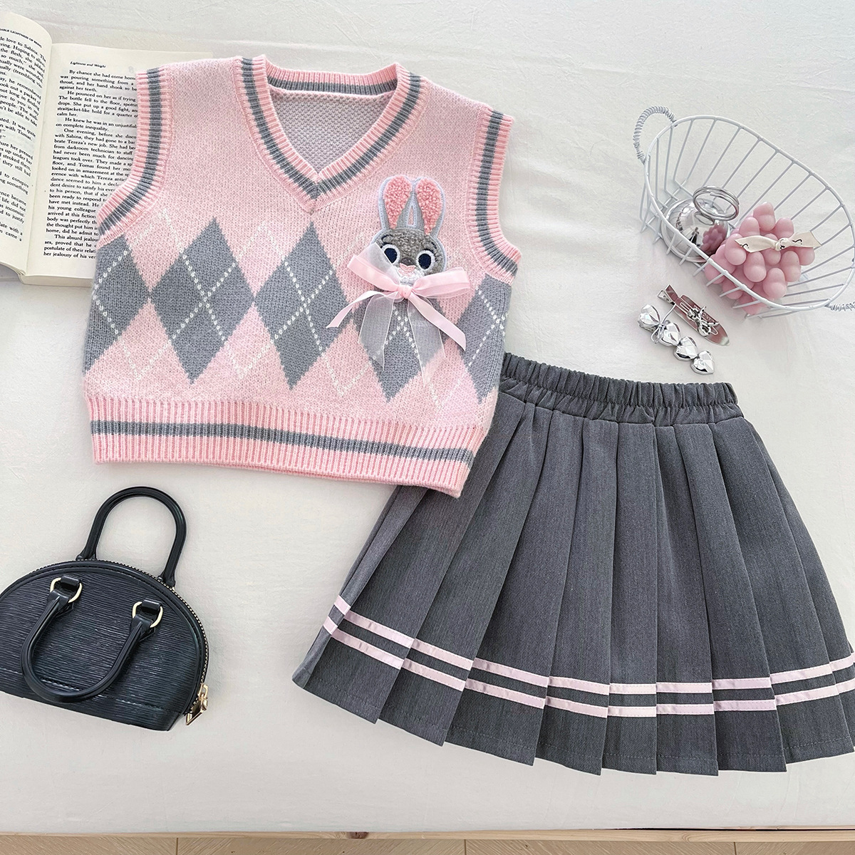 Set premium elegant de 4 piese din vestă cu aplicație plușată, cămașă, fustă plisată și cravată Student Bunny