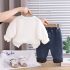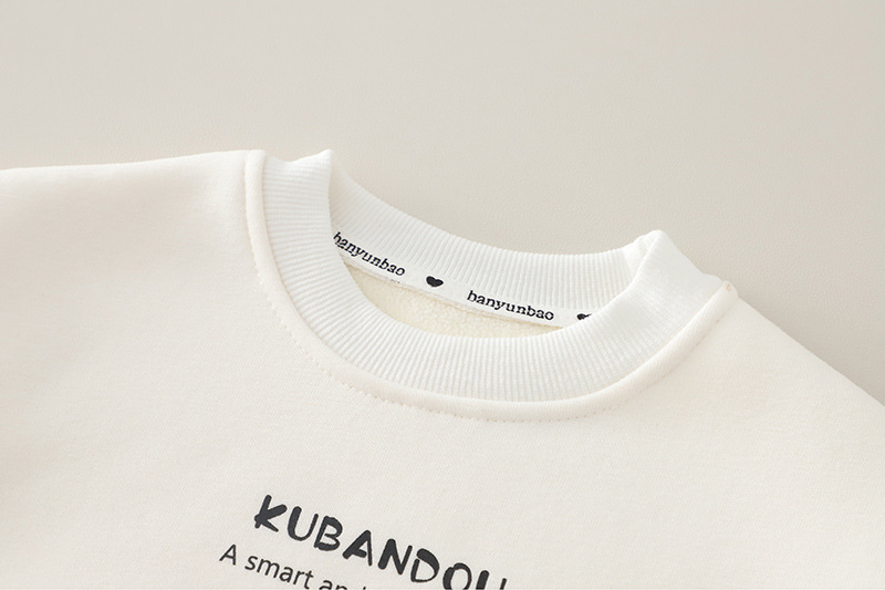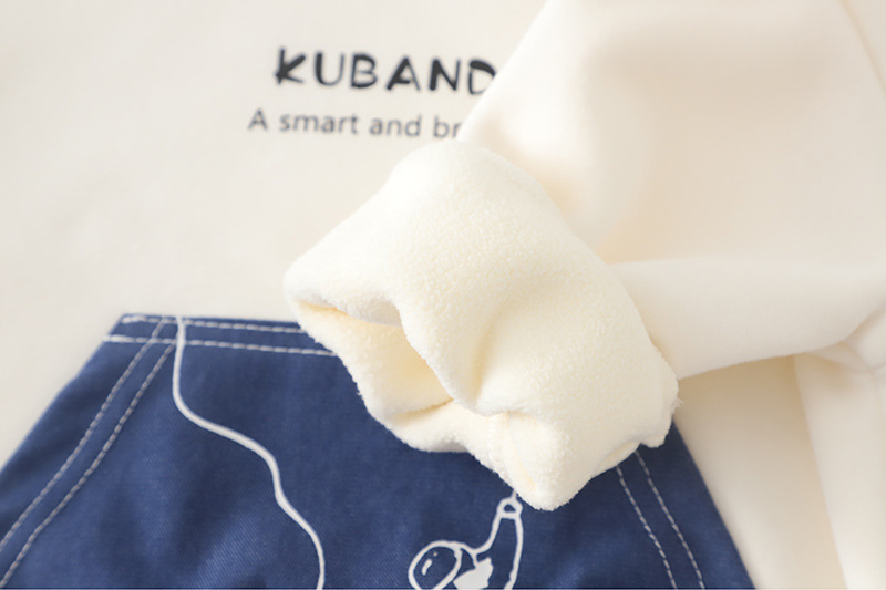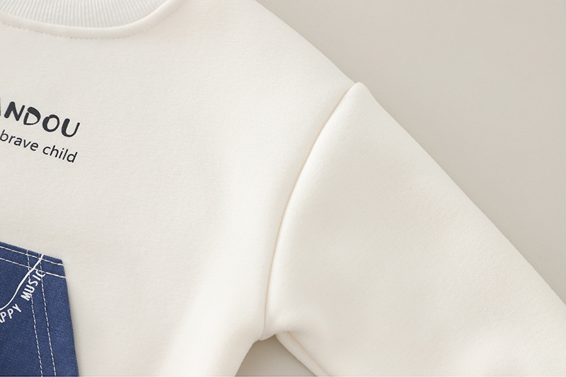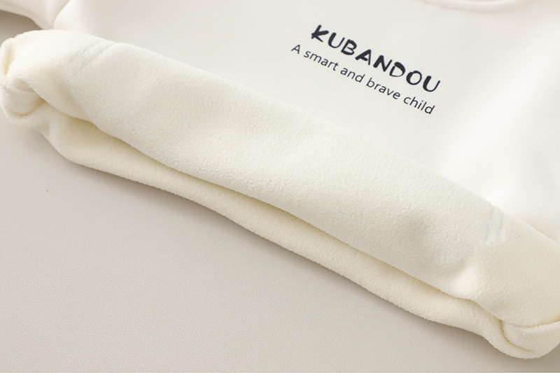 – Bluză/hanorac într-o nuanță caldă de ecru satinat, cu guler rib și buzunar frontal tip „kangaroo” din material denim, decorat cu aplicație de căști și inscripția „A smart and brave child”. Potrivită pentru purtare zilnică, cu interior căptușit pentru un plus de căldură.