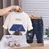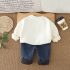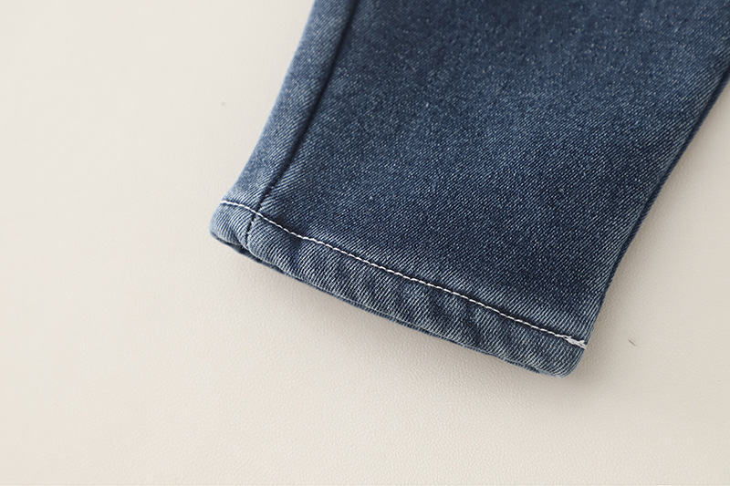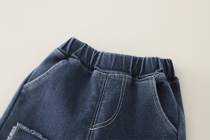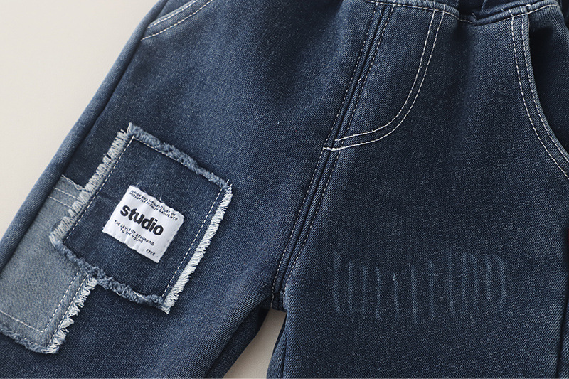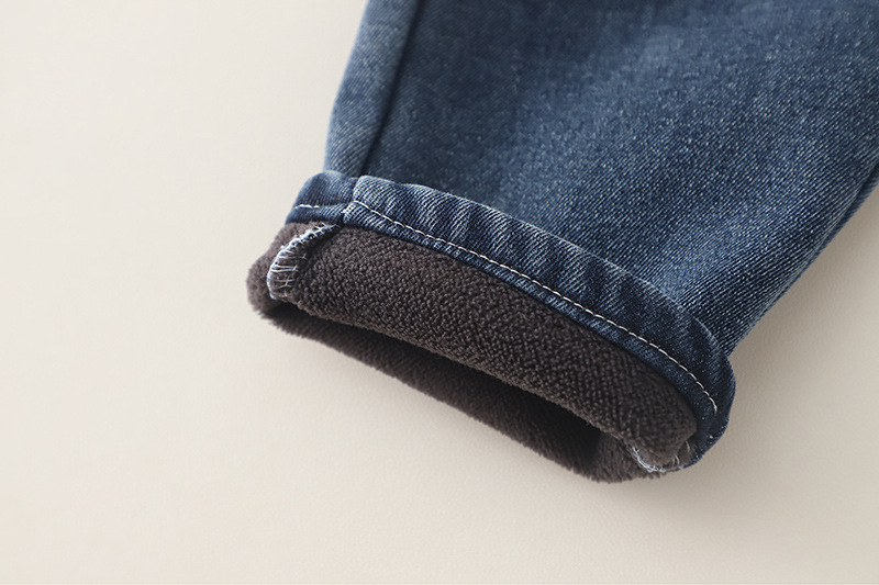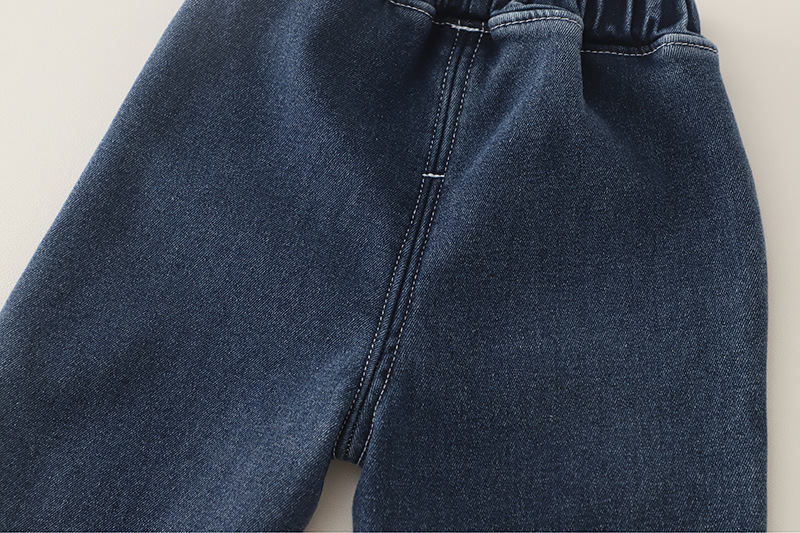 – Pantaloni din denim bleumarin cu efect ușor spălăcit, petice decorative contrastante și talie elastică. Interiorul căptușit moale oferă confort în zilele răcoroase.
