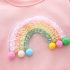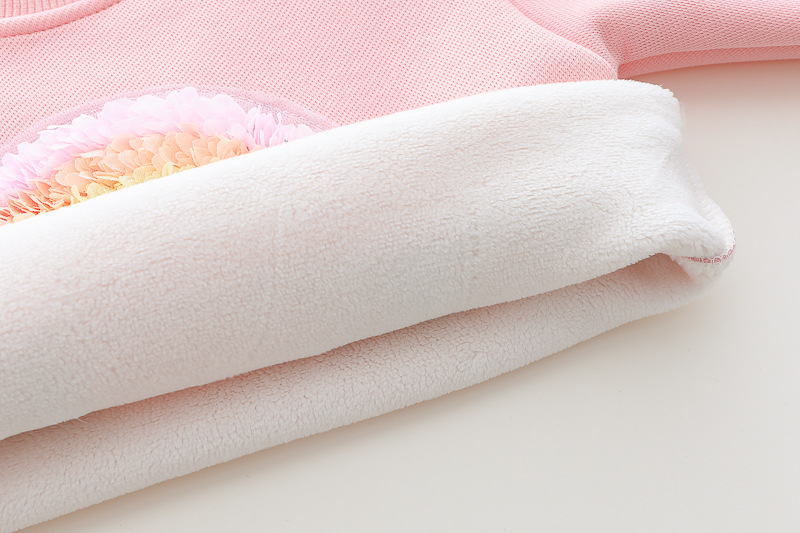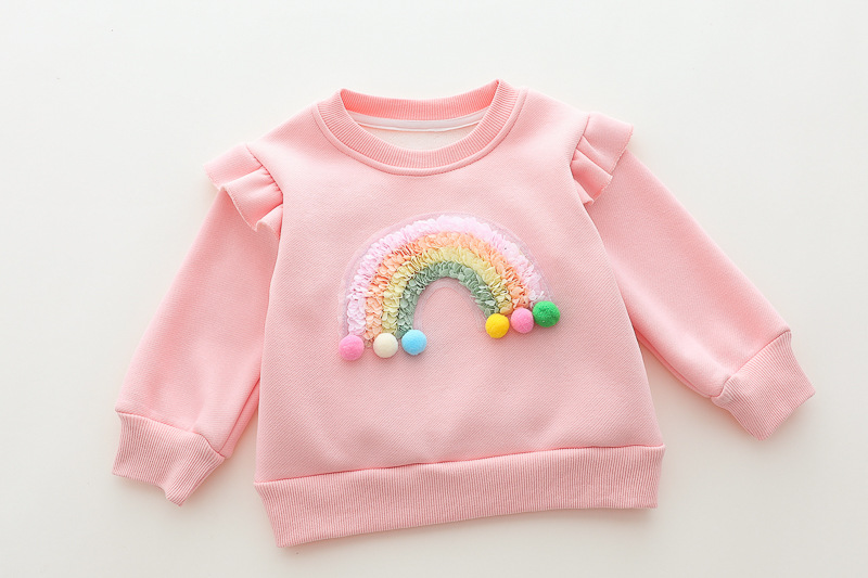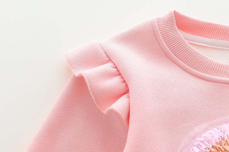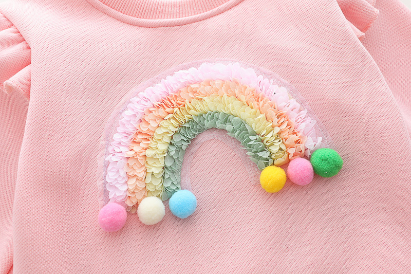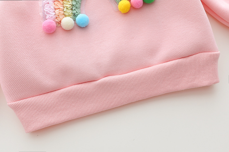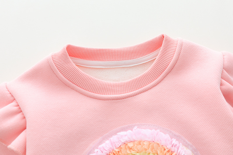 – Bluză/hanorac matlasat din material tip „lacoste”, într-o nuanță roz delicat, decorată cu volănașe la umeri și un curcubeu 3D spectaculos din dantelă și pompoane colorate pufoase – un adevărat deliciu vizual!