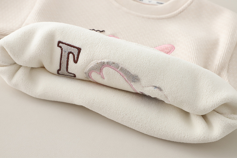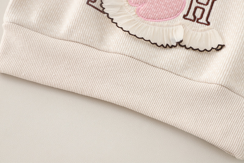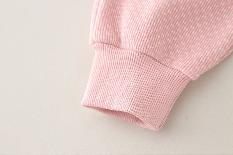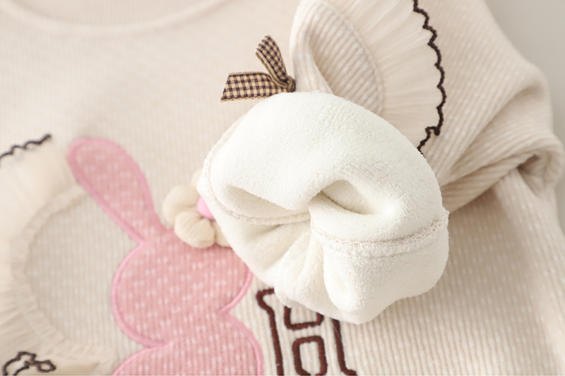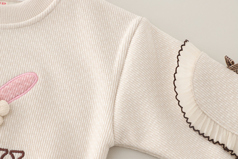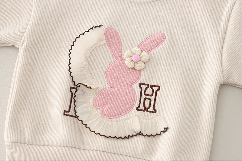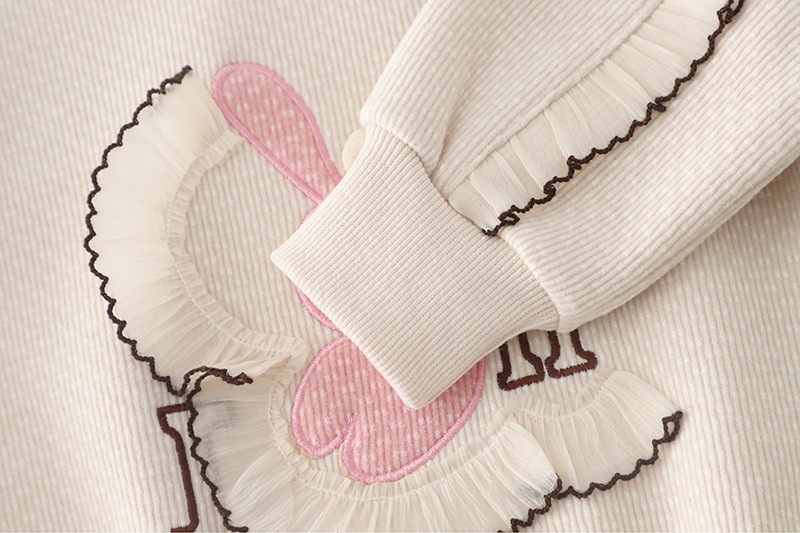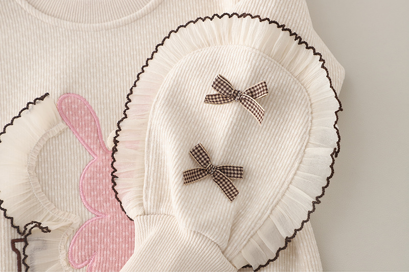 – Hanorac confecționat din material moale cu textură în relief și căptușeală ușoară, într-o nuanță caldă de bej. Decorat cu o aplicație roz cu iepuraș, floricele și detalii 3D care adaugă un efect tridimensional. Mânecile sunt împodobite cu fundițe mici, iar tivurile – cu volănașe fine.