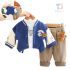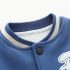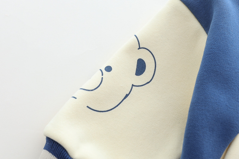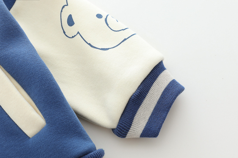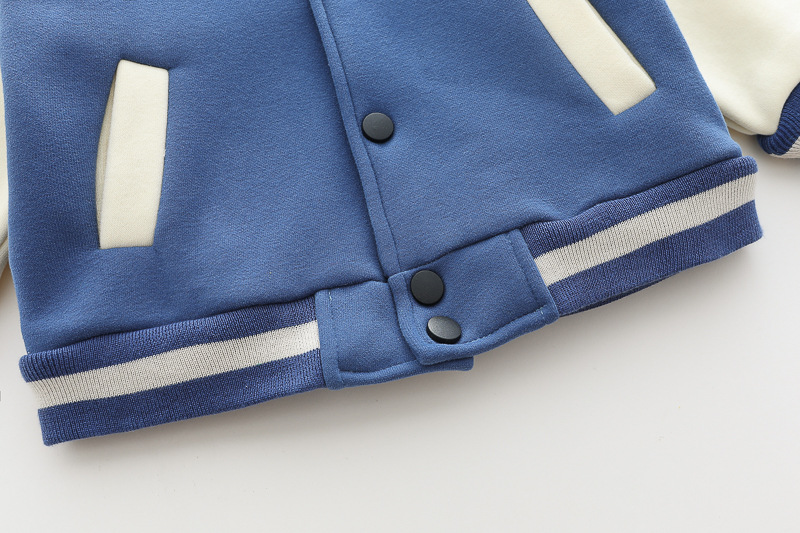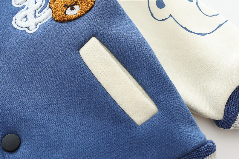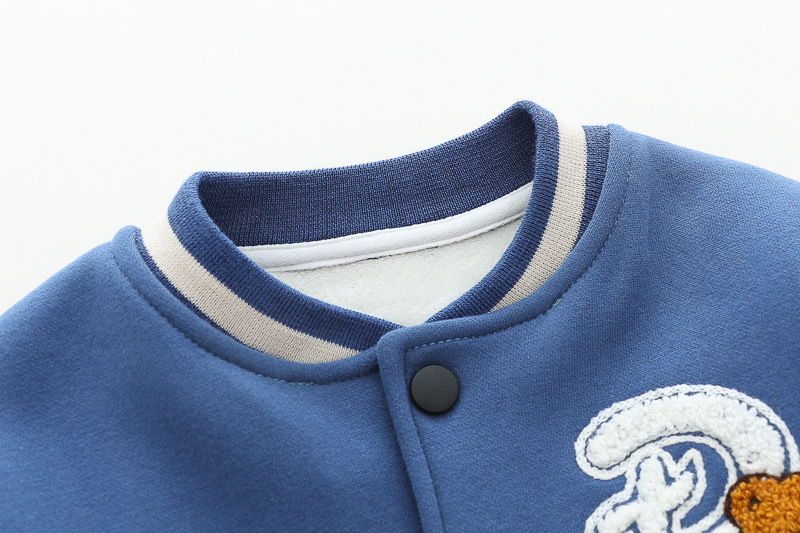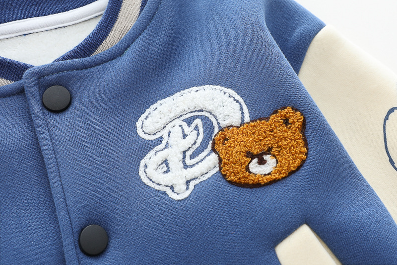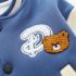 – Geacă matlasată tip „bomber” în nuanțe de albastru și crem, cu elemente ripsate contrastante, guler sport și închidere cu capse. Este decorată cu o aplicație 3D de ursuleț și o literă brodată – detalii care adaugă un aer jucăuș și un stil aparte.