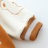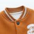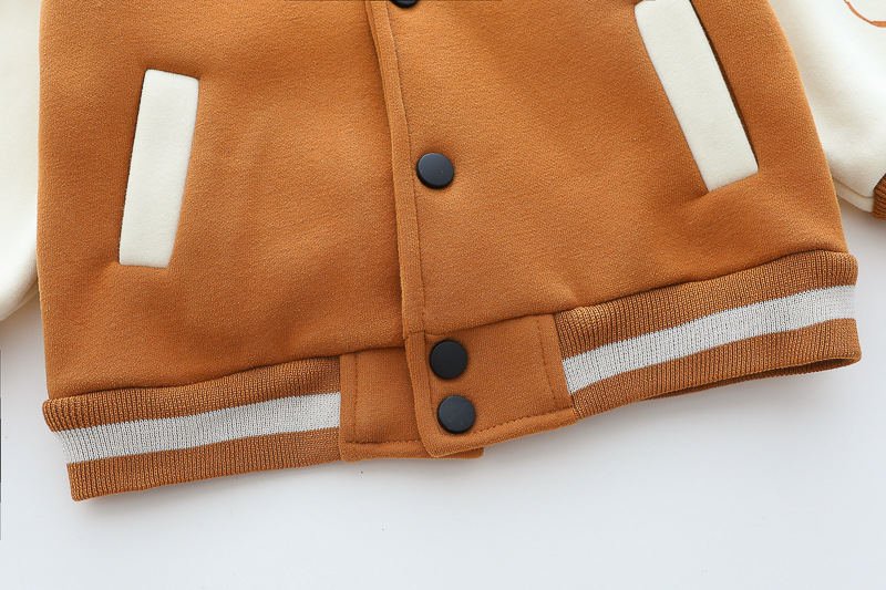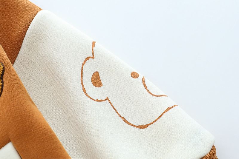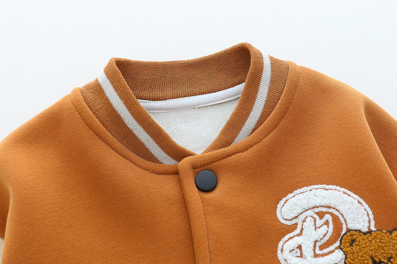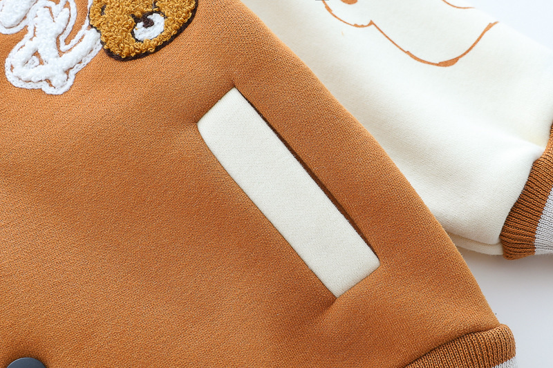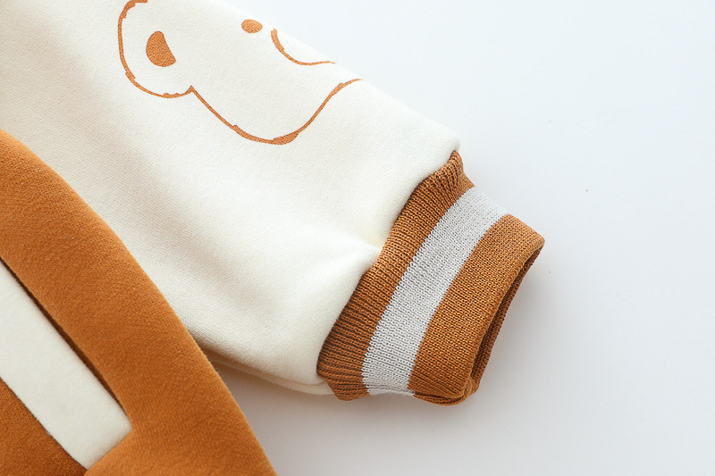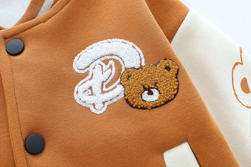 – Geacă matlasată tip „bomber”, în nuanțe caramel și crem, cu detalii ripsate contrastante, guler sport și închidere cu capse. Este decorată cu o aplicație pufoasă de ursuleț și o literă brodată – elemente care adaugă un aer jucăuș și un stil aparte.
