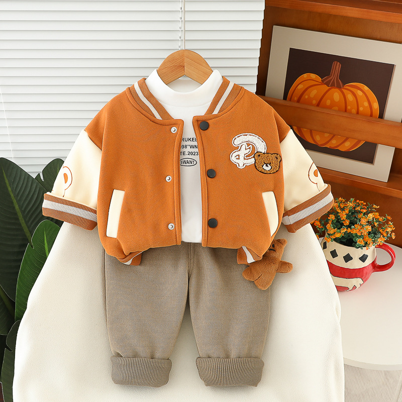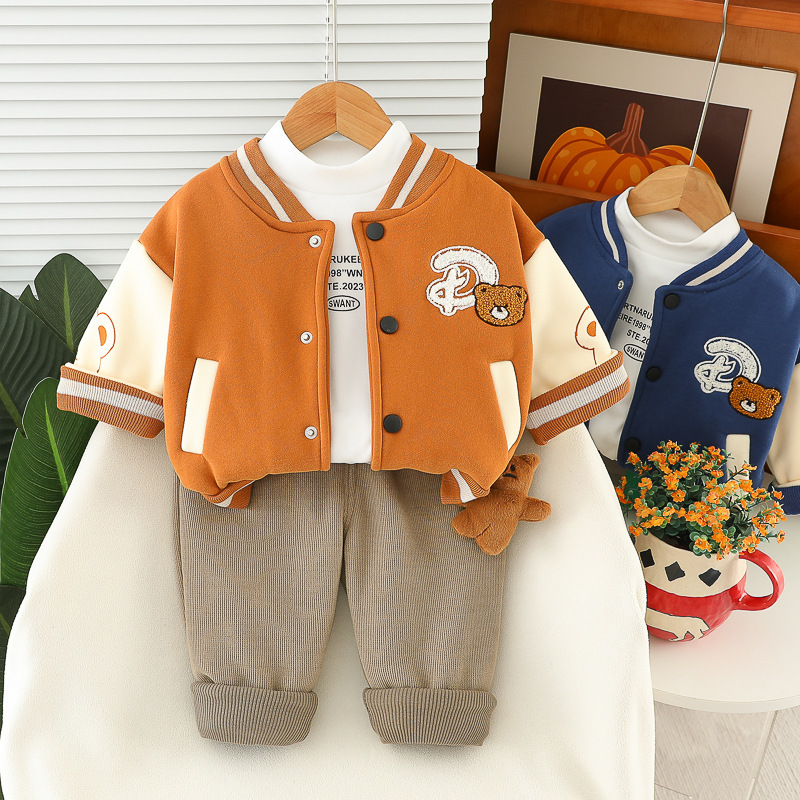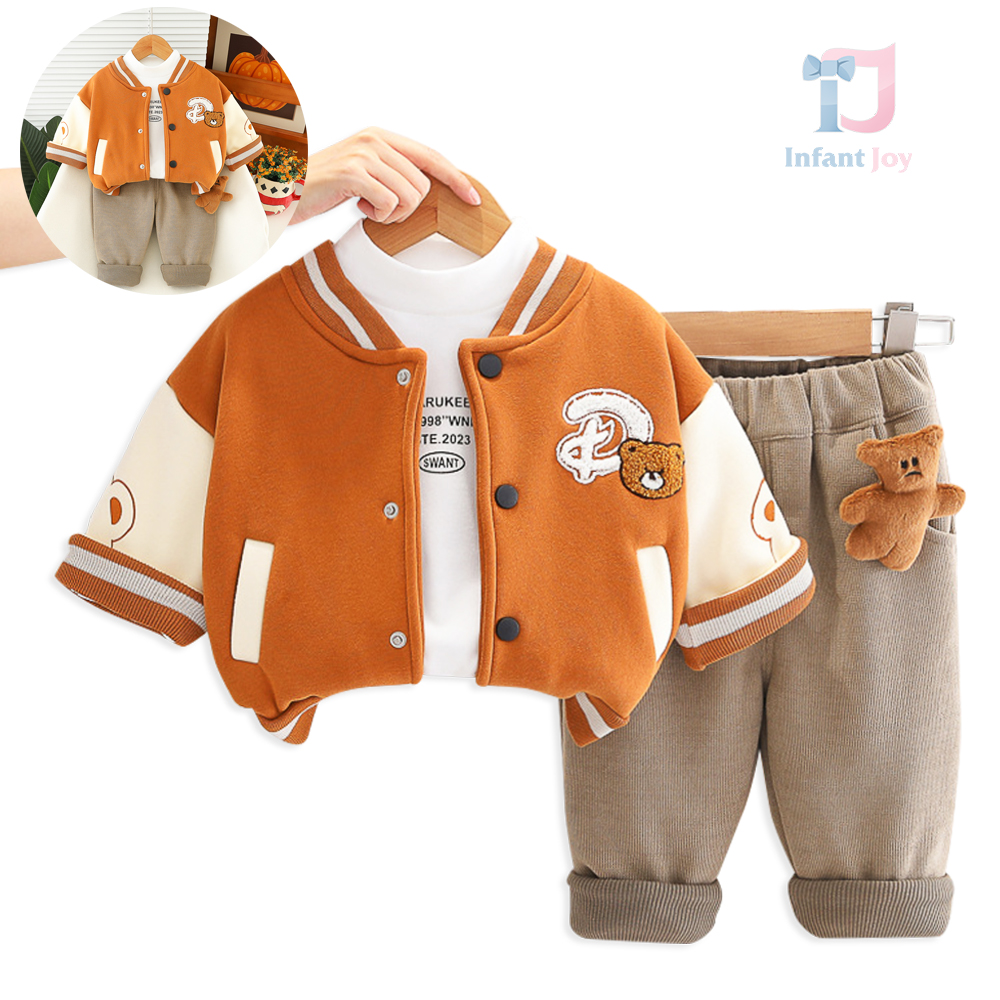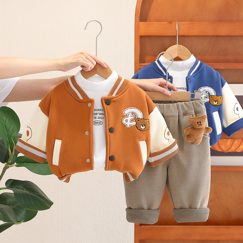 Set premium matlasat de 3 piese cu jachetă/bomber, bluză tip polo și pantaloni din denim cu aplicație 3D Teddy Crew