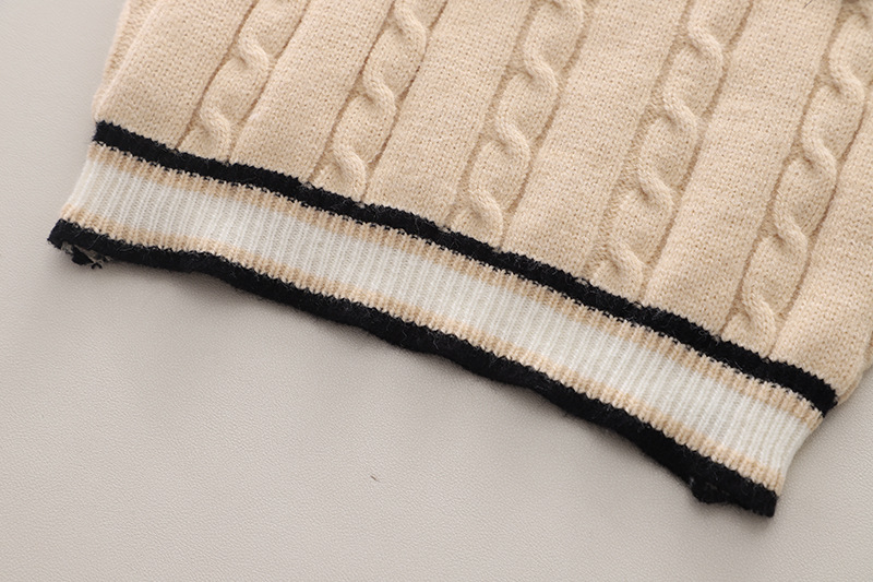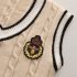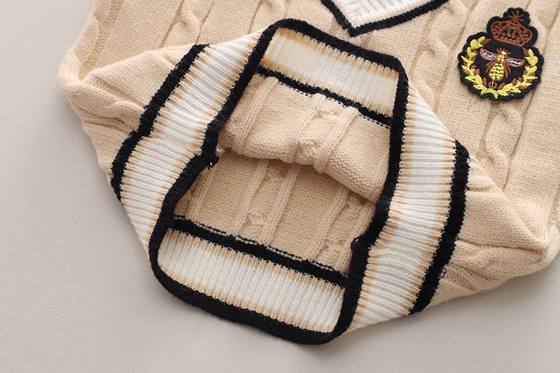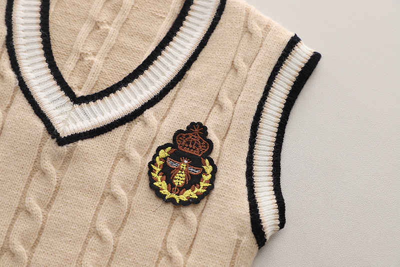 – Vestă tricotată, fără mâneци, într-un ton bej deschis, cu margini contrastante negre și emblemă cu motive regale. Modelul are o țesătură groasă, clasică, ce adaugă stil.