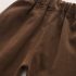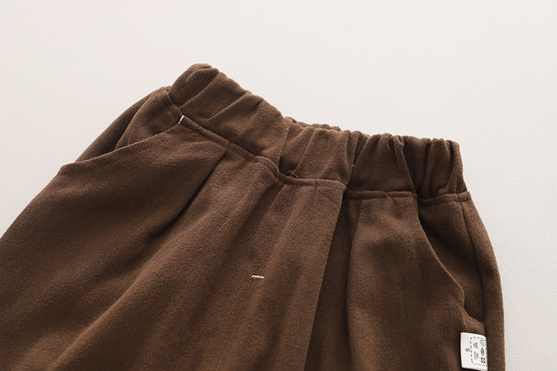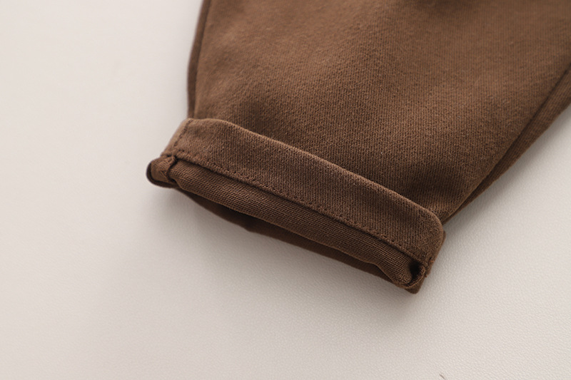 – Pantaloni drepti, într-o nuanță maro închis, cu talie elastică largă și tivuri întoarse. Designul oferă libertate de mișcare și este completat de două buzunare practice.