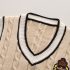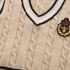 – Vestă tricotată fără mâneci, într-o nuanță bej deschis, cu dungi contrastante negre și emblemă cu motive regale. Tricotajul gros oferă un plus de rafinament.