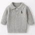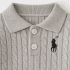 – Pulover tricotat într-o nuanță frumoasă de gri deschis, cu model în relief tip „cordoane răsucite”, care conferă un aspect rafinat și clasic. Partea superioară este prevăzută cu un guler elegant și două nasturi în față. O mică broderie mai închisă la culoare pe piept adaugă un accent fin, premium. Mânecile se termină cu manșete confortabile pentru o formă mai bună și căldură suplimentară.