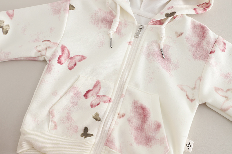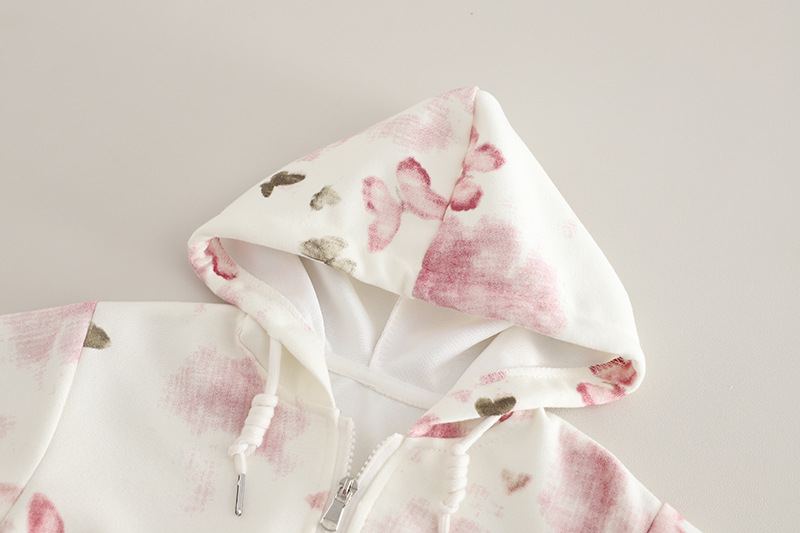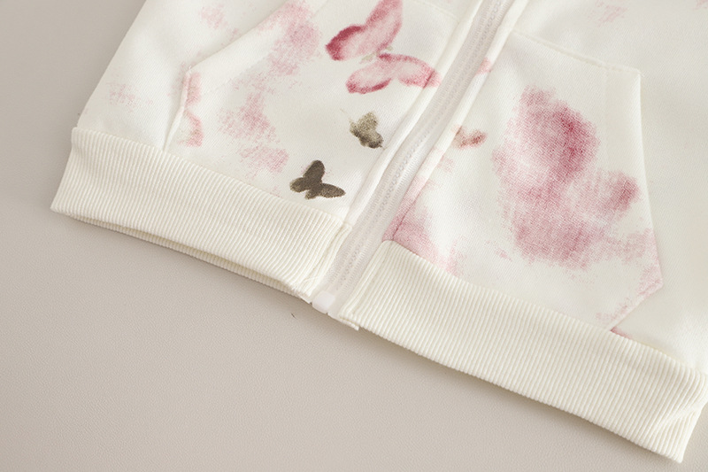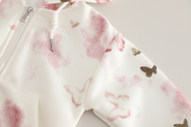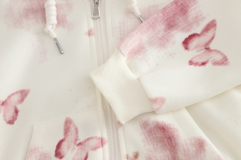 -Hanorac cu glugă, de culoare crem, decorat cu fluturi roz și maro delicat. Modelul are fermoar în partea din față pentru o îmbrăcare ușoară și buzunare practice. Mânecile sunt finisate cu manșete care asigură o potrivire confortabilă și stabilă.