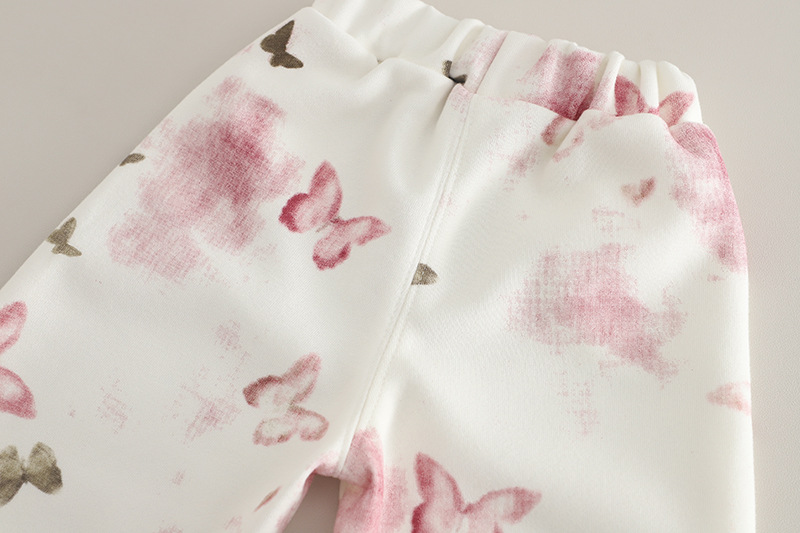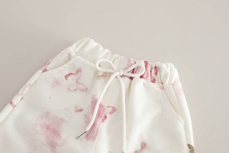 -Pantaloni, cu talie elastică și șnur decorativ, concepuți pentru confort maxim și libertate de mișcare. Efectul tie-dye și motivele cu fluturi adaugă o notă elegantă ținutei.