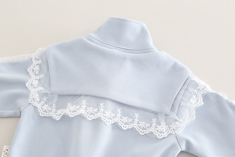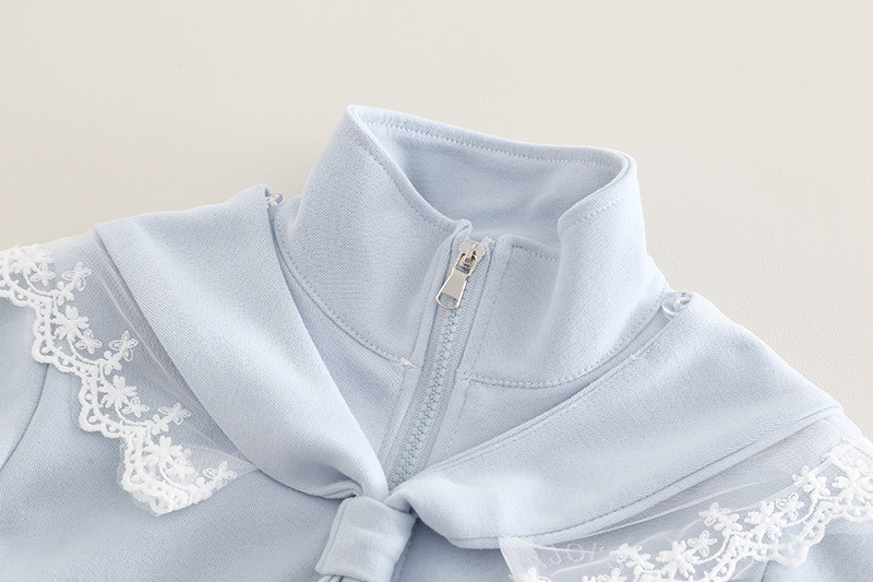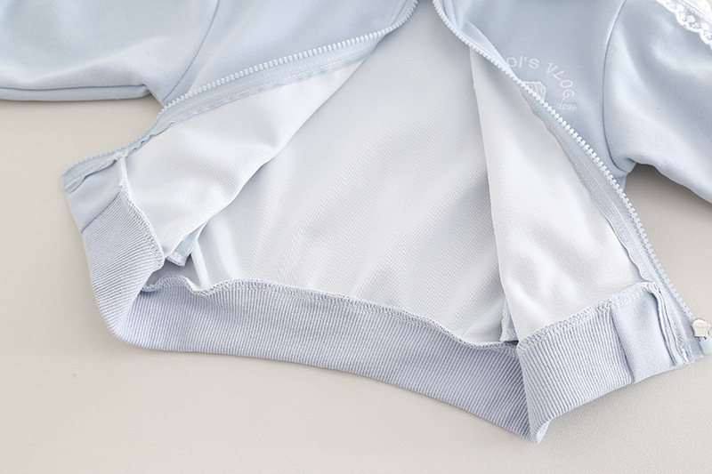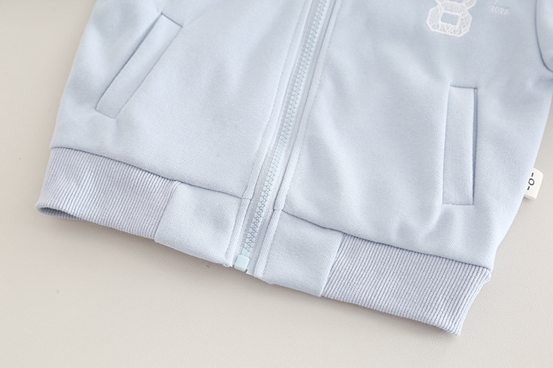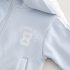 – Hanorac din material moale de bumbac, în nuanță bleu. Model cu guler înalt, închidere cu fermoar, două buzunare și o mică broderie albă decorativă.