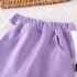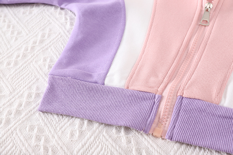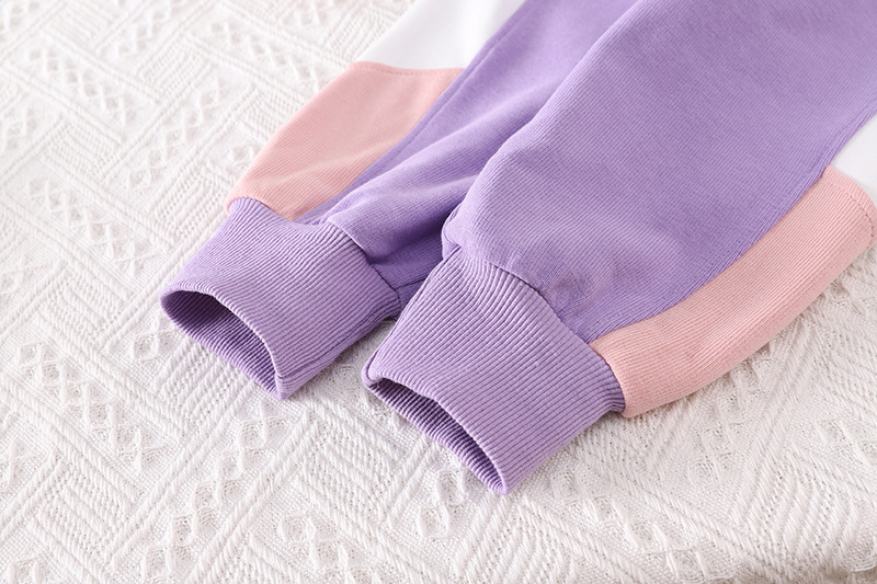 – Pantalon sport din același material, în nuanță principală mov. Croială tip „balloon” cu talie și manșete elastice la glezne. Accente contrastante în alb și roz pe laterale, în armonie cu partea superioară.