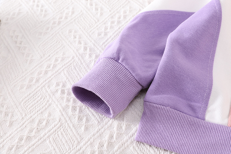 – Hanorac tip sweatshirt din bumbac moale. Model cu glugă și fermoar pe toată lungimea. Croială lejeră, cu mâneci lungi și manșete elastice. Decorat cu elemente geometrice late în alb și mov, pe partea din față și pe mâneci.