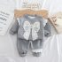 – Bluziță tip hanorac cu mânecă lungă, confecționată din material de bumbac în culoare gri deschis. Modelul are decolteu rotund și finisaj cu nervuri, iar mânecile sunt decorate cu accente din dantelă albă la nivelul umerilor și manșetelor, care oferă finețe și rafinament. Punctul central este o aplicație mare din dantelă în formă de fundiță în partea din față, completată cu elemente perlate în centru – un detaliu diafan și elegant.