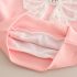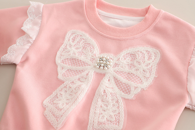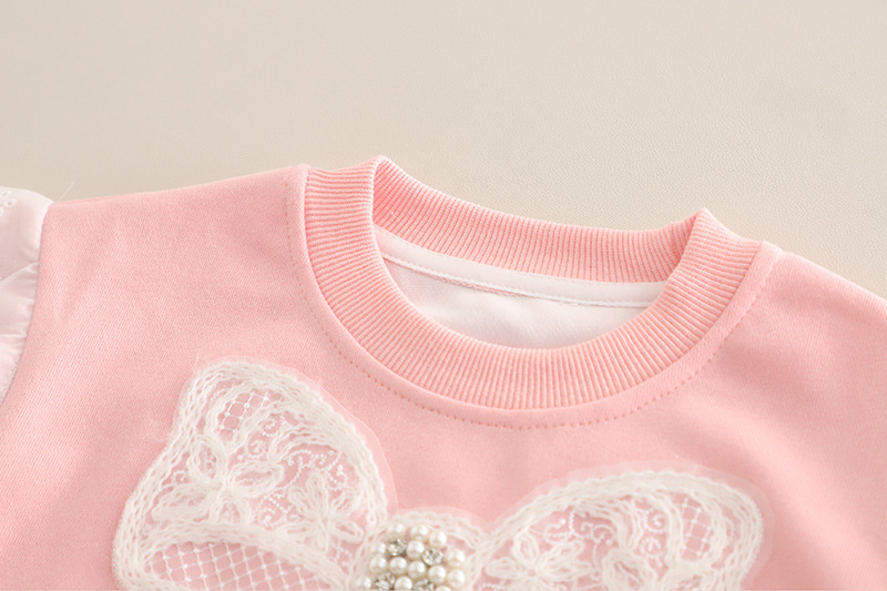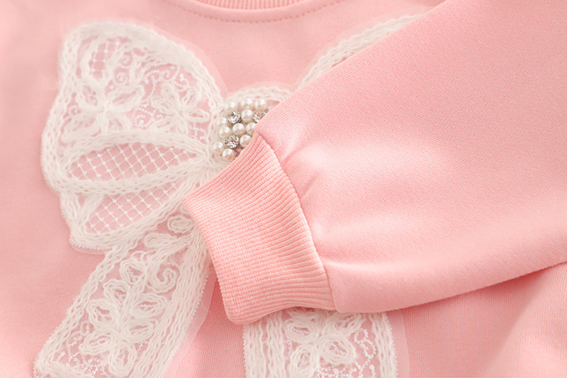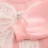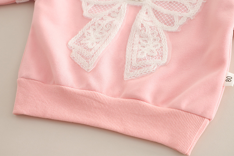 – Bluză tip sweatshirt cu mânecă lungă, confecționată din material de bumbac în culoare roz. Modelul are decolteu rotund și tiv din rips, iar mânecile sunt decorate cu accente din dantelă albă la nivelul umerilor și manșetelor, adăugând un plus de finețe și rafinament. Punctul central este aplicația mare din dantelă în formă de fundă, completată de elemente perlate în centru – un detaliu delicat și elegant.