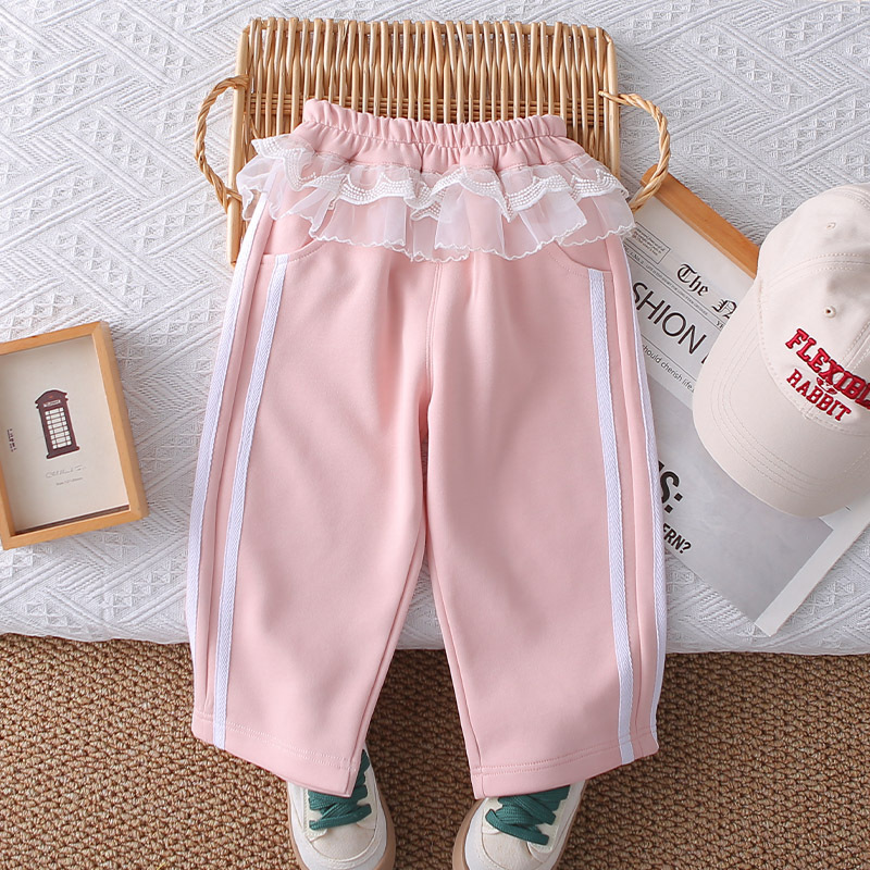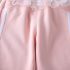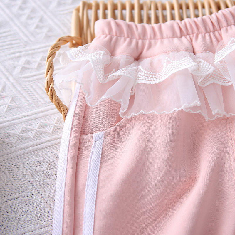– Pantalon cu talie elastică, ce asigură confort și libertate de mișcare. Modelul are volănaș decorativ în partea superioară, care adaugă un accent drăguț și feminin, precum și o bandă laterală contrastantă albă pentru un aspect sportiv. Cracii au o croială lejeră pentru confort maxim în timpul purtării.