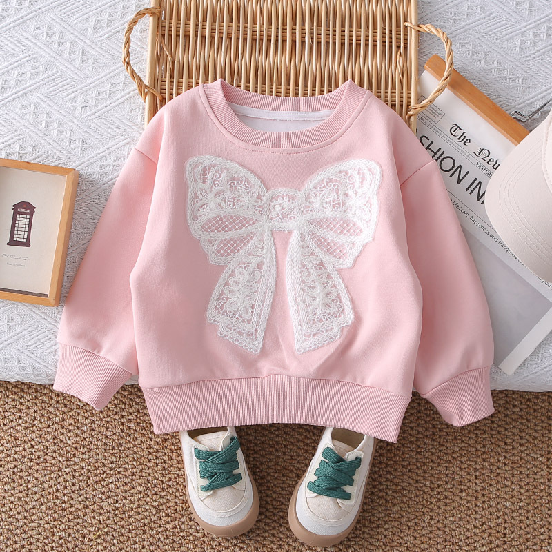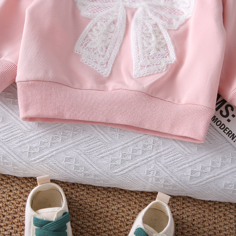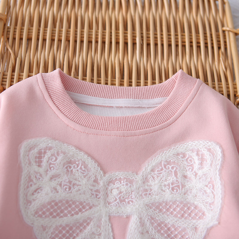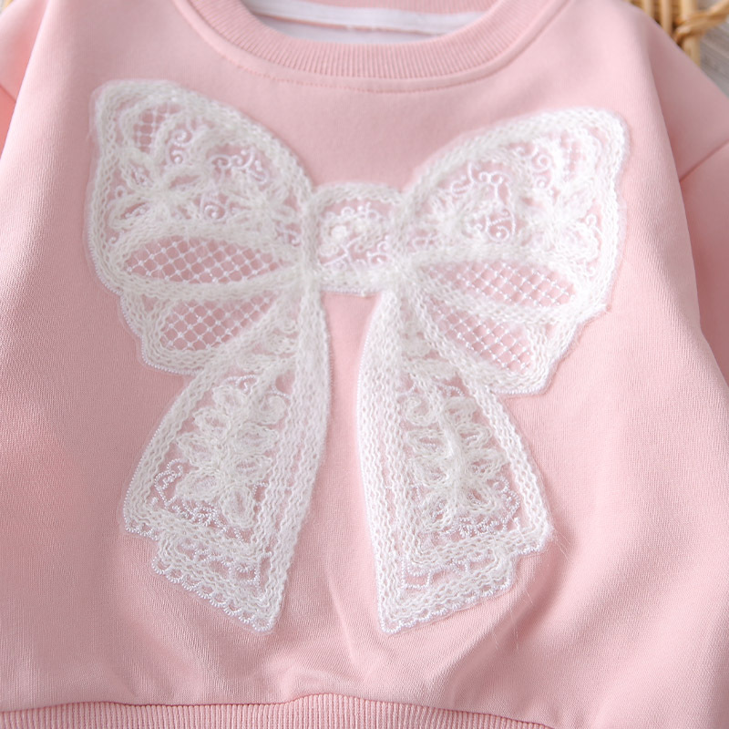 – Bluziță tip hanorac cu mânecă lungă, confecționată din material din bumbac de culoare roz. Modelul are decolteu rotund și terminație din tricot elastic, iar mânecile prezintă o ușoară îndoire pentru un efect lejer și stilat. Accentul principal este aplicația mare din dantelă în formă de fundă din partea din față – diafană, fină și extrem de delicată, care oferă un caracter romantic și rafinat ținutei.
