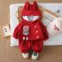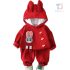 – Bluziță/hanorac cu glugă – model confortabil cu croială lejeră, realizat dintr-un material moale și plăcut la atingere, de culoare roșie. Accentul este pus pe adorabilul element 3D cu iepuraș, aplicat pe un buzunar decorativ, care adaugă un caracter jucăuș și amuzant ținutei. Au fost adăugate și morcovei decorativi, care completează designul tematic. Gluga oferă confort și stil suplimentar.