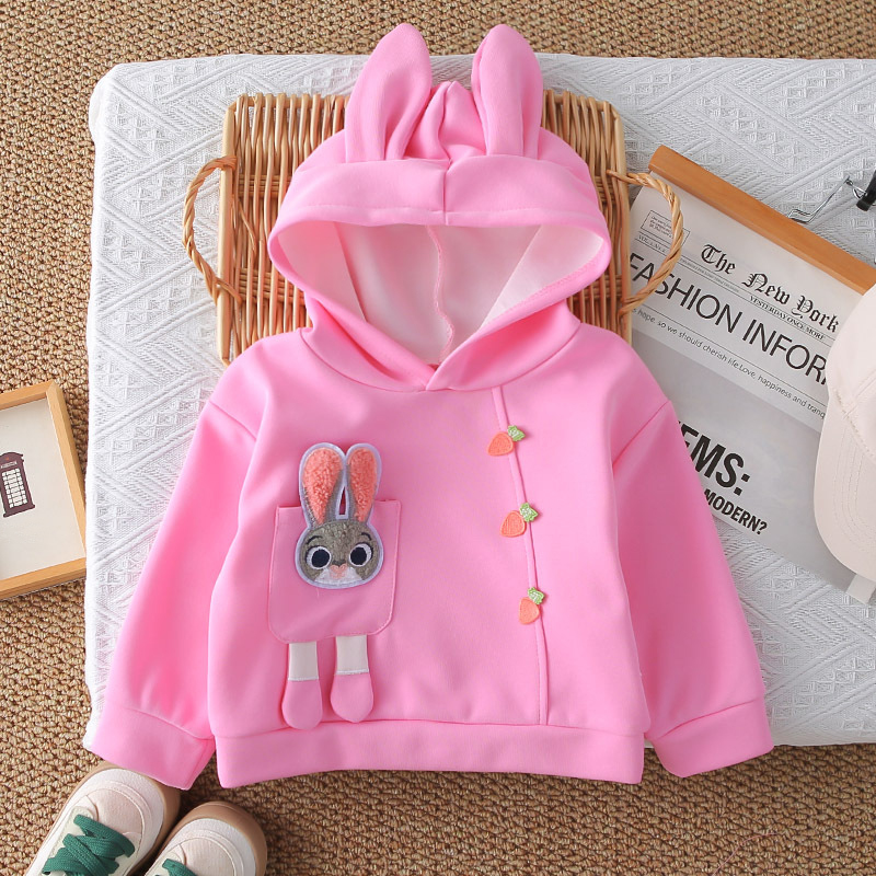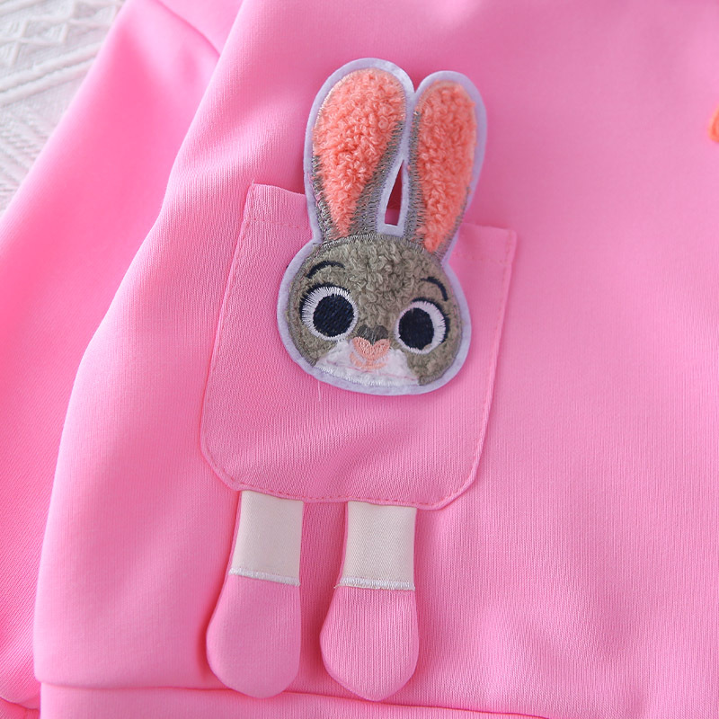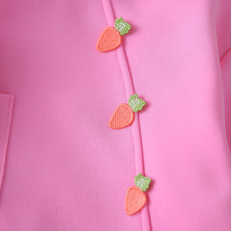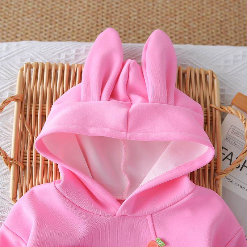 – Bluză/hanorac cu glugă – model confortabil cu croială lejeră, confecționat dintr-un material moale și plăcut la atingere, în culoare roz. Accentul este elementul 3D adorabil cu iepuraș, aplicat pe un buzunar decorativ, care oferă ținutei un aspect jucăuș și amuzant. Au fost adăugate morcovei decorativi, care completează designul tematic. Gluga adaugă confort și stil suplimentar.